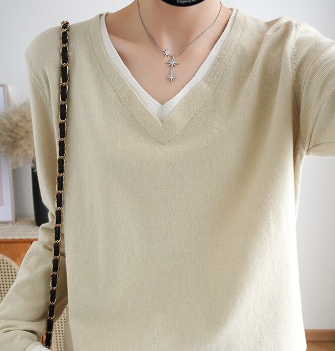 魅力的な風合いと、個性的なデザインが魅力の重ね着風ニットトップス。カジュアルからきれいめまで、幅広いスタイルに合わせやすいVネックと、袖ありで秋冬も活躍する長袖仕様です。