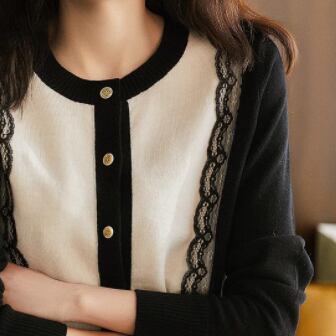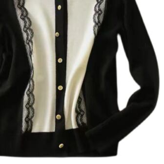 縦ラインを作るバイカラーに施されたレースが大人らしさと女性らしさをプラスしてくれるカーディガン♪