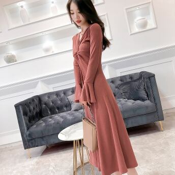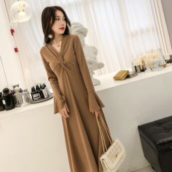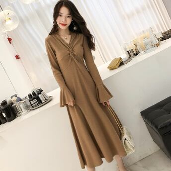 この秋冬おすすめのVネックニットロングワンピース。大人可愛いシンプルなデザインに、ファッションに敏感な女性たちから支持されています。ボリュームのある袖やAラインシルエットが、女性らしさを引き立てます。伸縮性の良いニット素材で動きやすく、着心地も抜群です。