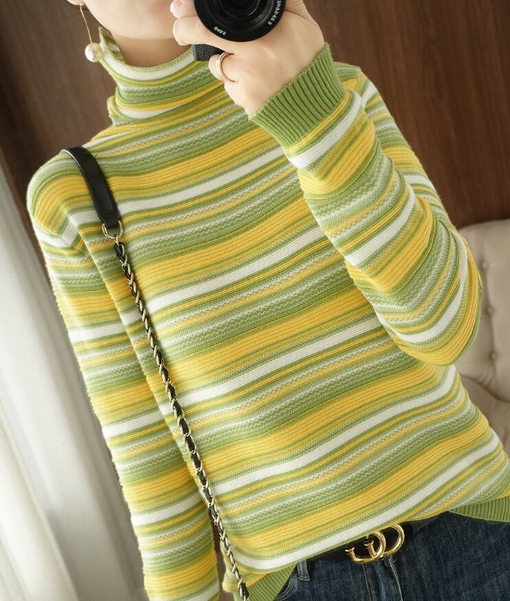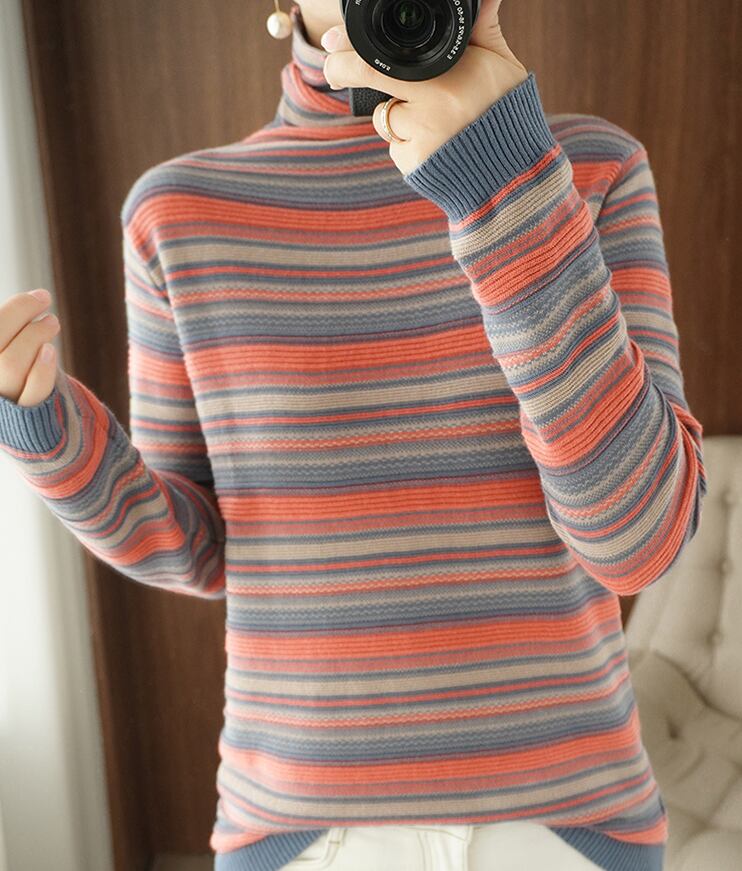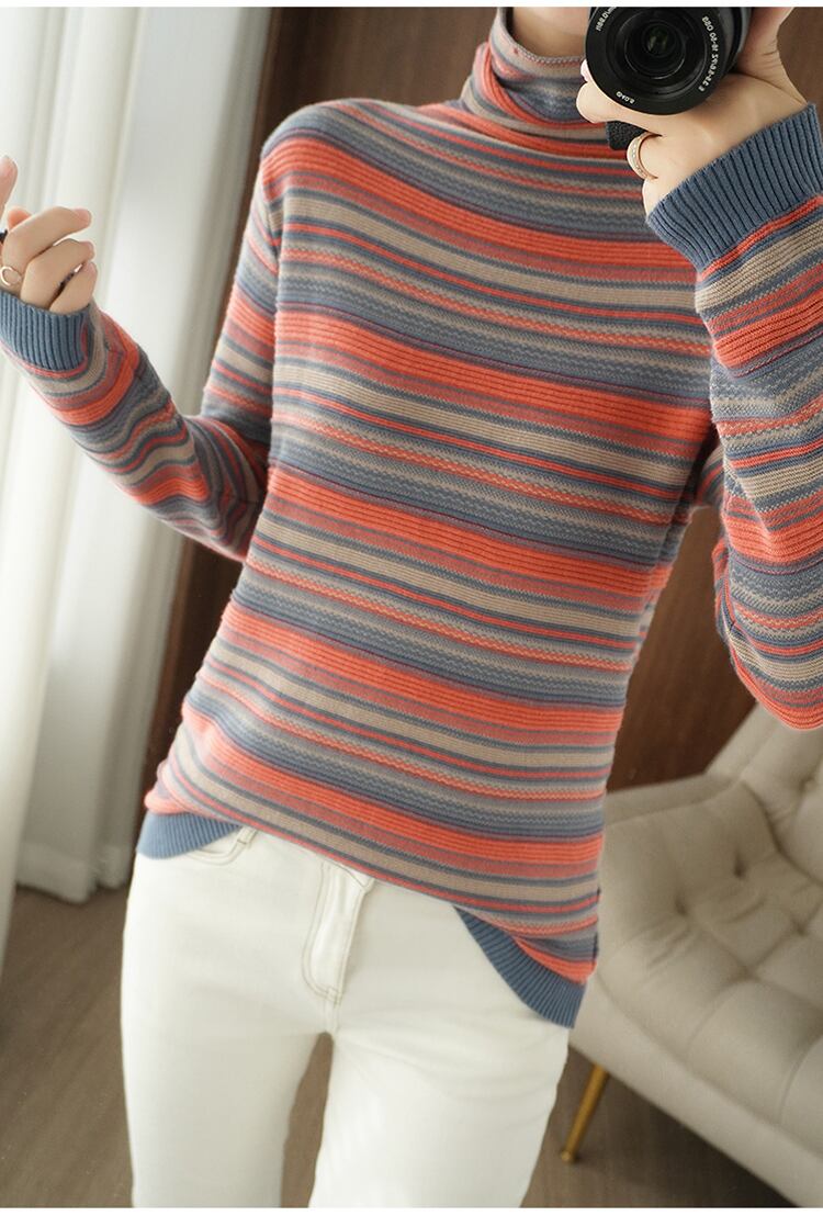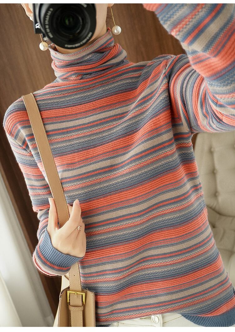 マルチカラーのボーダー柄がおしゃれなハイネックニット。カジュアルからきれいめまで幅広く対応するシンプルで上品な一枚です。袖が長く、ハイネックのデザインは寒い季節にもぴったり。一つひとつ手作りで編まれているので、あなたの手元に届く一着は世界に一つだけの特別な存在になります。