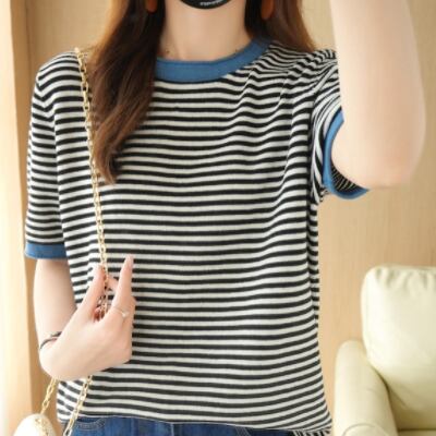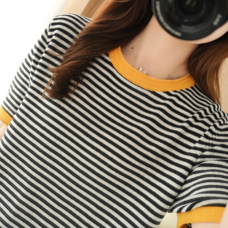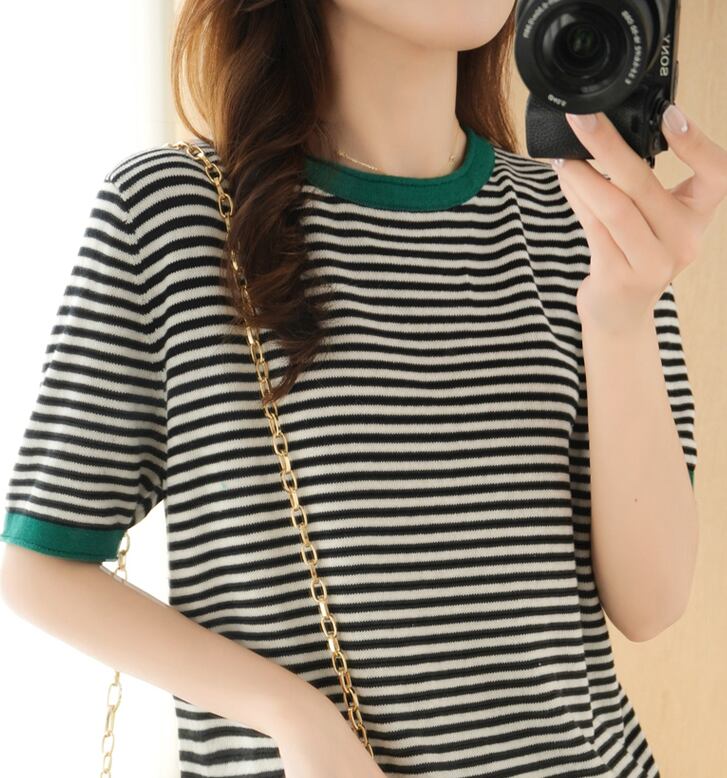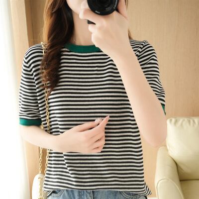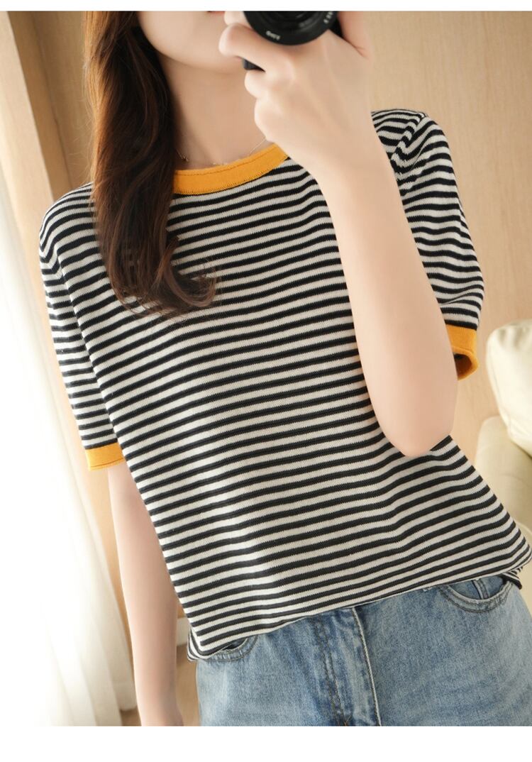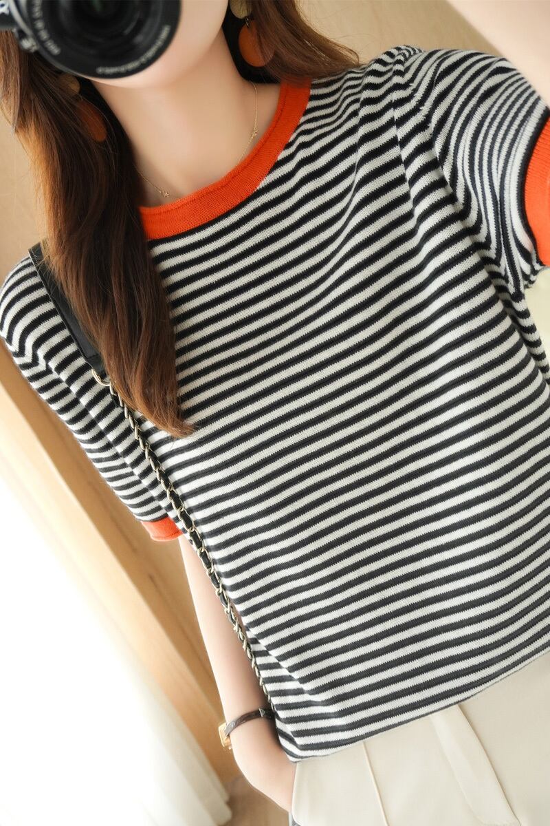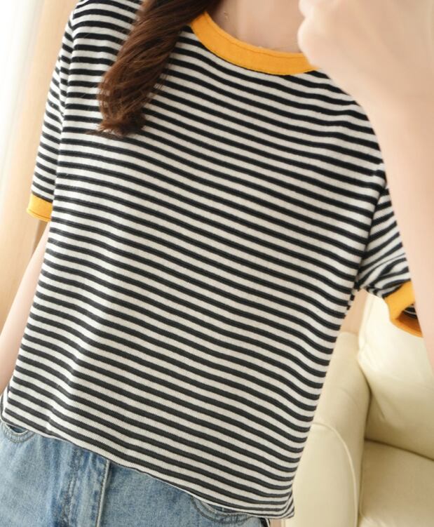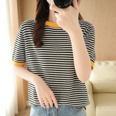 夏季シーズンにぴったりな、オシャレなパイピングボーダーTシャツをご紹介します。半袖タイプのTシャツは、綿素材を使用しており、心地よい着心地と通気性が抜群です。ラウンドネックのデザインは、いろんなスタイルに合わせやすく、カジュアルな着こなしに最適。パイピングが施されたボーダー柄が、可愛らしくレトロで、大人の女性でも楽しめるデザインです。