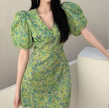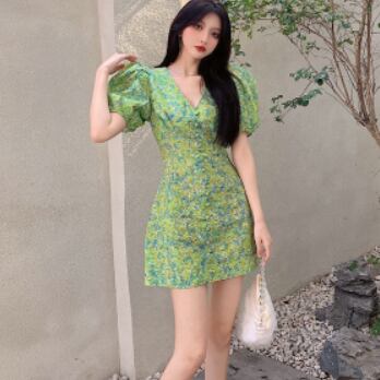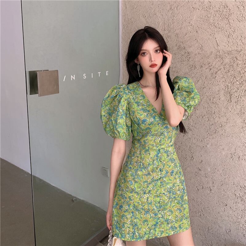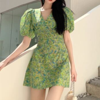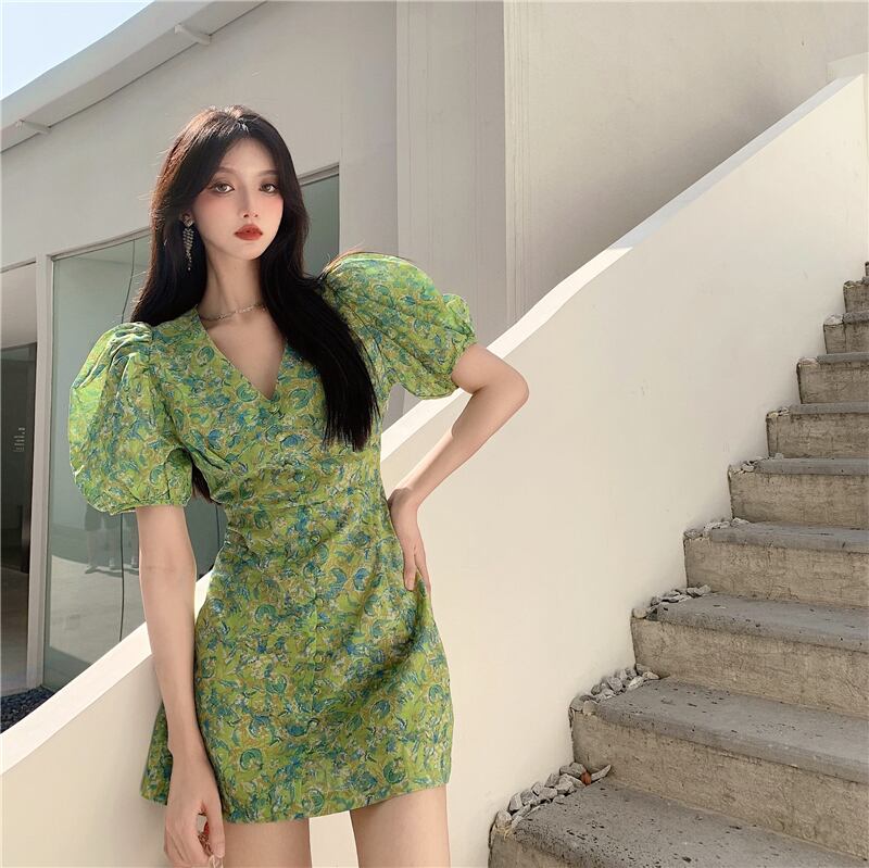 ワンピース ミニ ミニ丈 ショート ショート丈 半袖 ボリューム袖 パフスリーブ Vネック スリム タイト 細身 スマート かわいい 大人可愛い 大人 おしゃれ お洒落 大人可愛い 大人女子 こなれ感 ラブリー キュート ガーリー 個性的 セクシー エレガント 主役級 存在感 柄 春 夏 10代 20代 30代 レディース 女性用 女の子 韓国 韓国系 ファッション コーデ モテ 新作 定番 送料無料 トレンド 流行 インスタ映え インポート 海外 人気 大人カジュアル 女子力 ボタン フェミニン