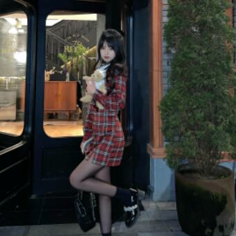 フリルネックブラウスに赤チェックワンピを重ね着しているように見える、胸元切り替えデザインのドッキングワンピース。