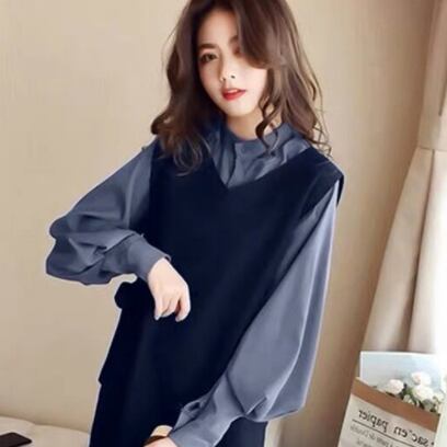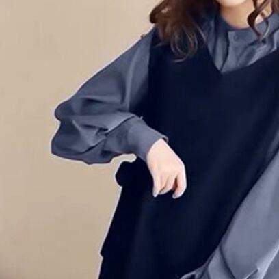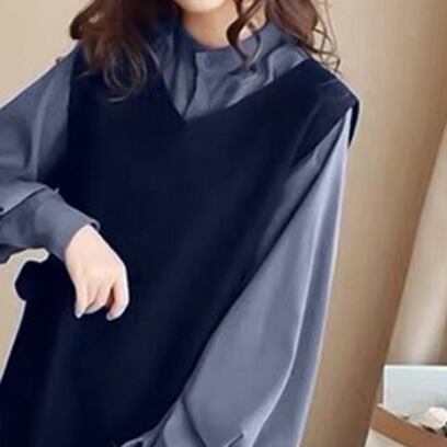 このセットアップは、トップスとワンピースの2点セット。大人可愛い、上品なデザインで、さまざまなシーンで活躍します。膝丈のワンピースには、立ち襟とリボンが付いていて、エレガントな印象を与えます。長袖のシャツは、インナーにもアウターにも使えるので着回し力も◎。