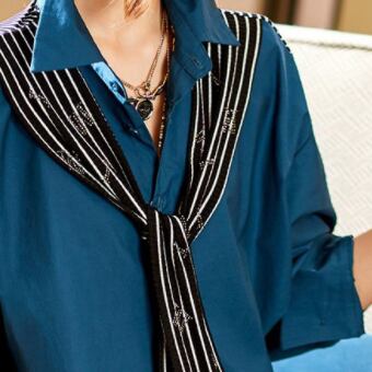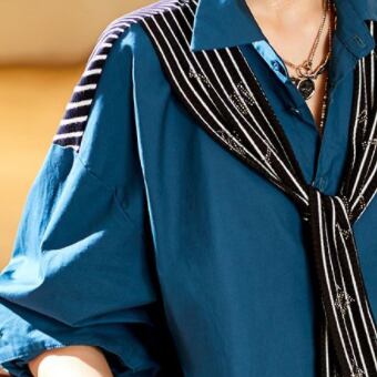 シャツとしてはもちろん、ノンショールスタイルでも着用できるドッキングデザインは、着回し力も抜群!薄手の綿素材は季節を問わずお使いいただけます。
