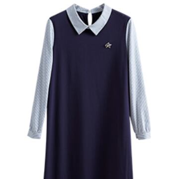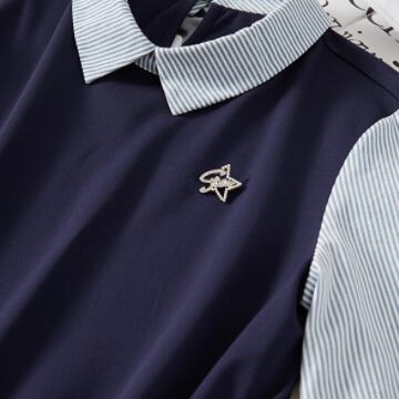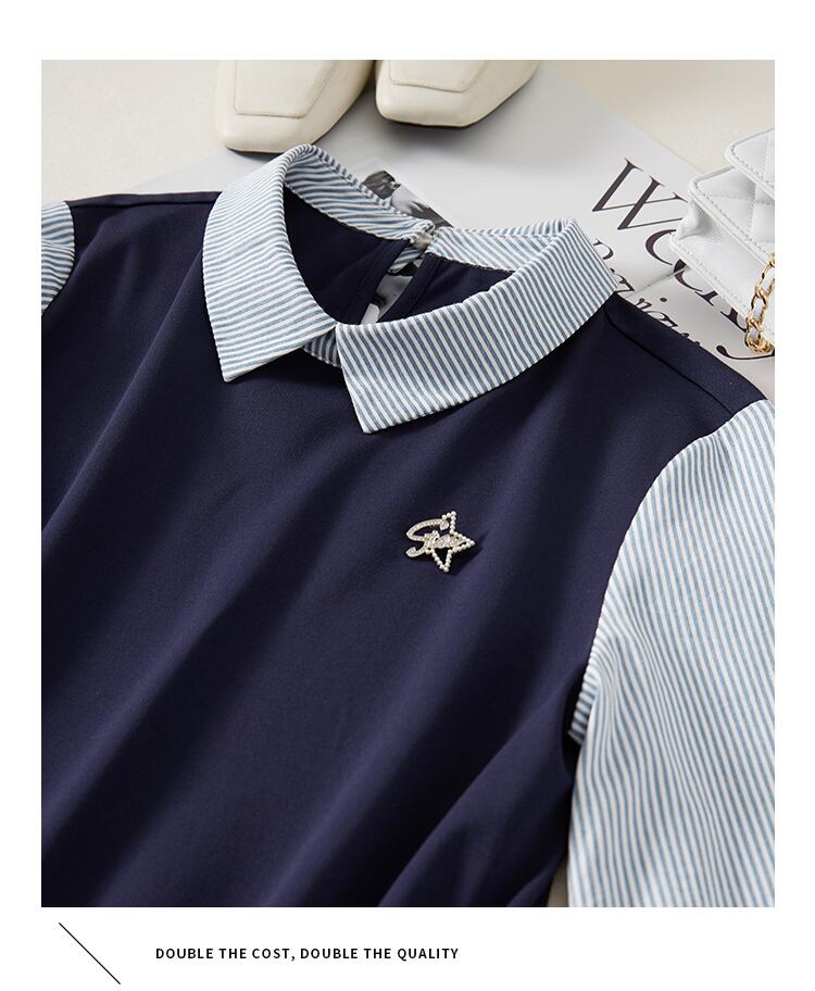プルオーバーとしても、ジャンパースカートとしても楽しめるドッキングワンピース。ポロカラー襟が上品な印象を与え、パフスリーブが可愛いらしさを演出します。切り替えデザインが体型カバーにも役立ち、ストライプ柄がさりげないアクセントに。幅広い年齢層に愛される、大人可愛いアイテムです。