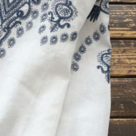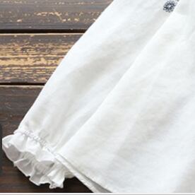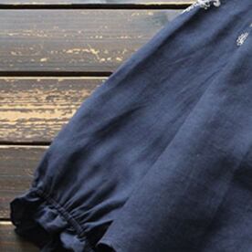 気になるデザインは、白地に深みのあるネイビーの刺繍が美しい1色展開。襟ぐりや袖口は、フリルデザインで存在感を煌めかせます。ラウンドネックで着心地も抜群です。