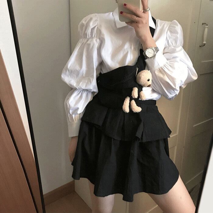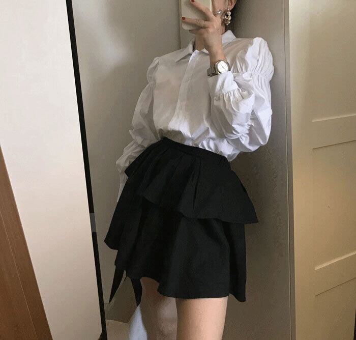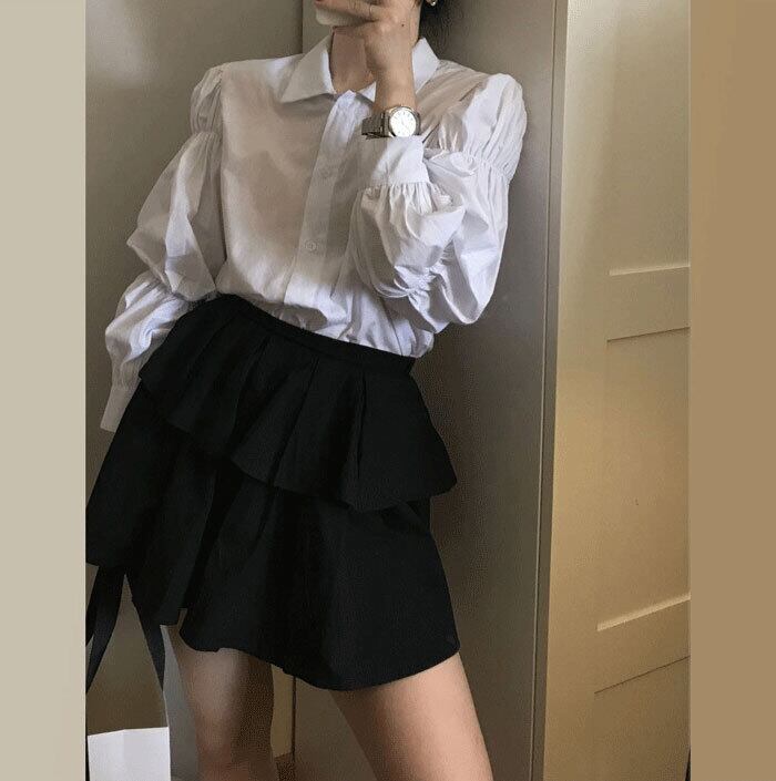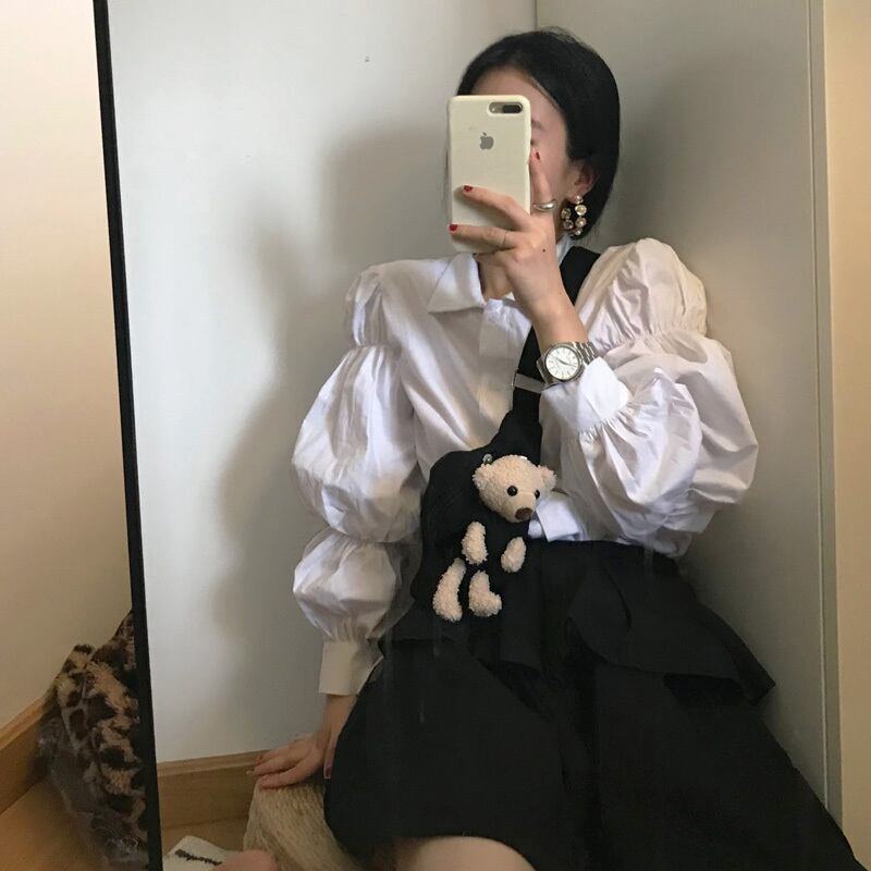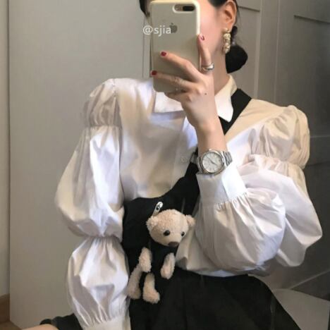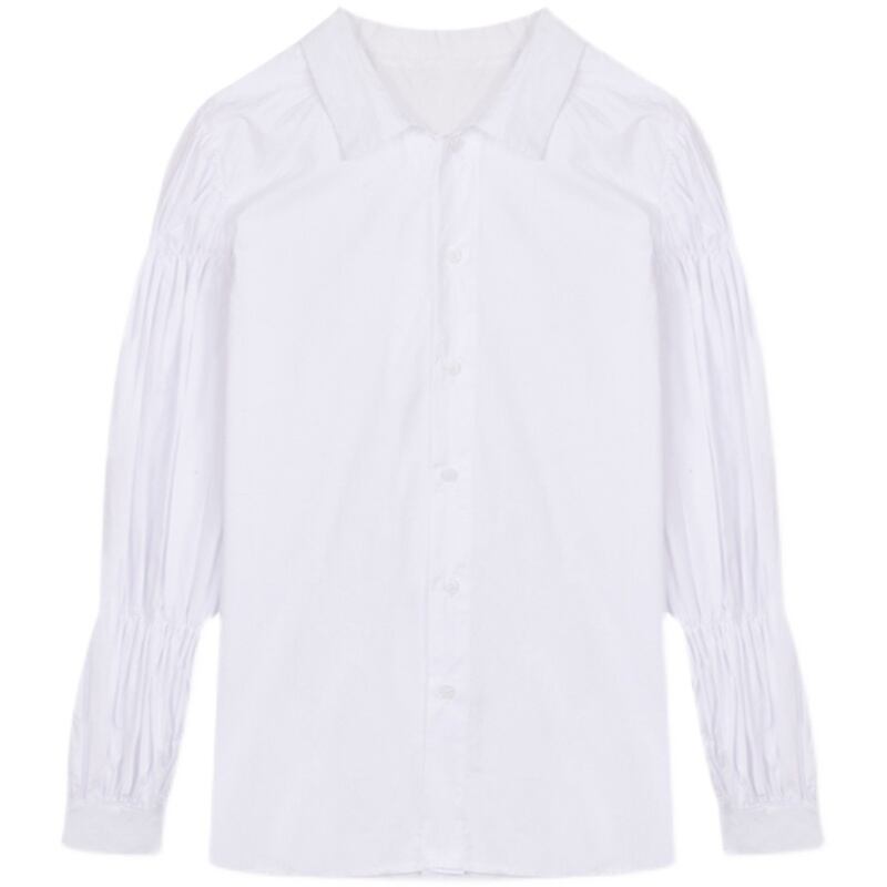 肩幅よりも広めのオーバーサイズデザインで、フワッとしたジュリエットスリーブが可愛い、ふんわりしたチュニック丈トップスです。女性らしい襟付きで、前開きになっているのもポイント。スカートにもパンツにも合わせやすく、カジュアルにもきれいめにも着こなせます。長袖なので、春・秋・冬の3シーズン活躍するアイテム。白の無地で、カラバリに困らないところも嬉しいですね。また、体型をカバーしてくれるゆったりサイズ展開(S/M/L/XL)も充実しています。トレンドのオルチャンファッションから、大人可愛い、上品、こなれ感を演出するのにぴったりなデザインです。