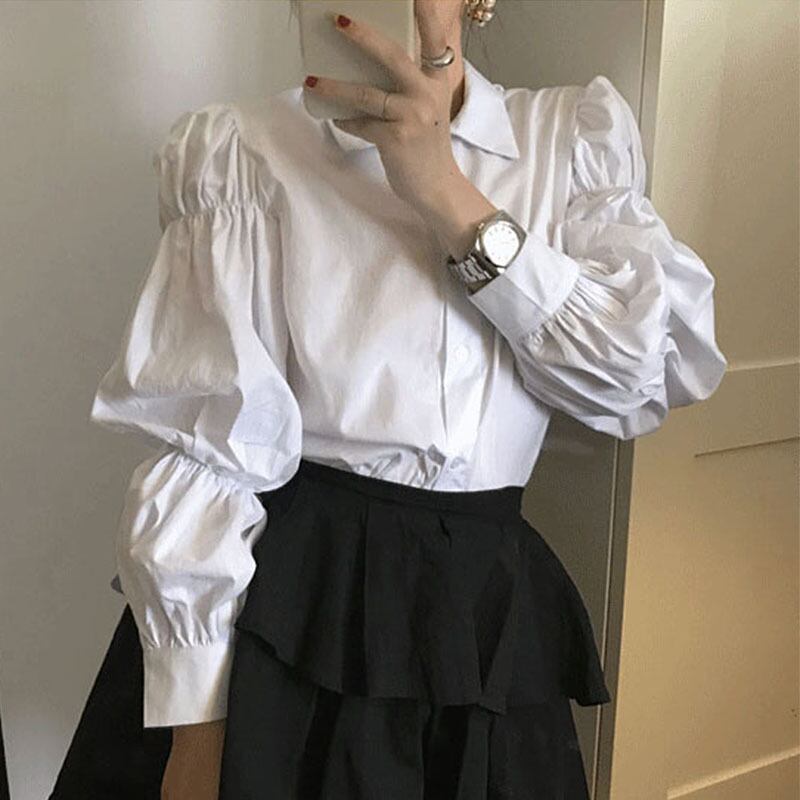 オーバーサイズ ふんわり ジュリエットスリーブ チュニック丈 トップス シャツ ブラウス 白シャツ ミディアム丈 長袖 ボリューム袖 襟付き 前開き 綿 かわいい 大人可愛い きれいめ シンプル カジュアル 上品 おしゃれ お洒落 大人女子 こなれ感 キュート 個性的 存在感 無地 春 秋 冬 レディース 女性用 ママ 女の子 学生 通学 デート お出かけ 女子会 休日 レストラン 着回し 普段使い 重ね着 韓国系 オルチャン ファッション 体系カバー S M L XL ゆったり サイズ ホワイト