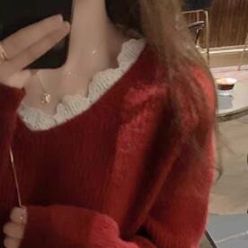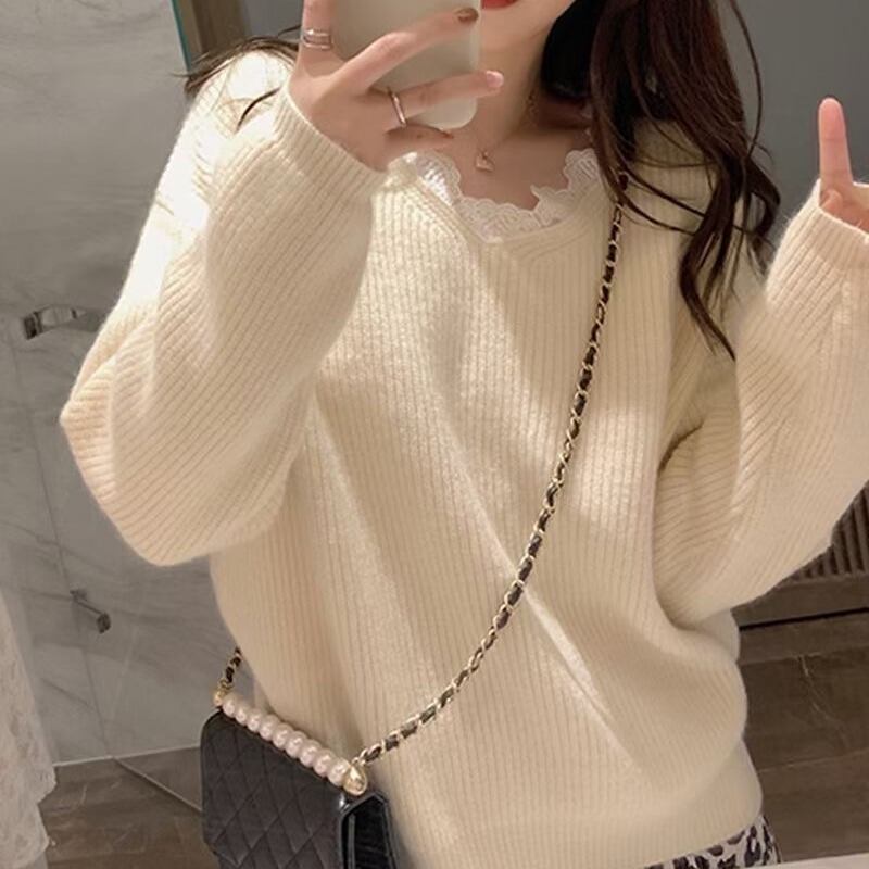重ね着風 ネックフリルトリミング スカラップフリル トップス セーター ミディアム丈 長袖 ドロップショルダー 萌袖 Vネック 切り替えデザイン レース ニット 異素材MIX かわいい 大人可愛い きれいめ シンプル カジュアル 上品 おしゃれ お洒落 大人女子 こなれ感 ガーリー 無地 春 秋 冬 レディース ママ 女の子 OL 通勤 学生 通学 デート お出かけ 女子会 休日 普段使い 韓国系 オルチャン スタイル L XL 2XL 3XL 4XL 大きいサイズ ホワイト グリーン ワインレッド