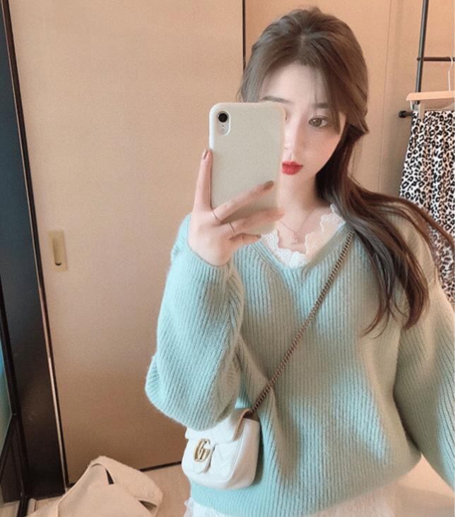 首元からレースのインナーをのぞかせているように見えるフリルトリミングデザインのVネックニット。