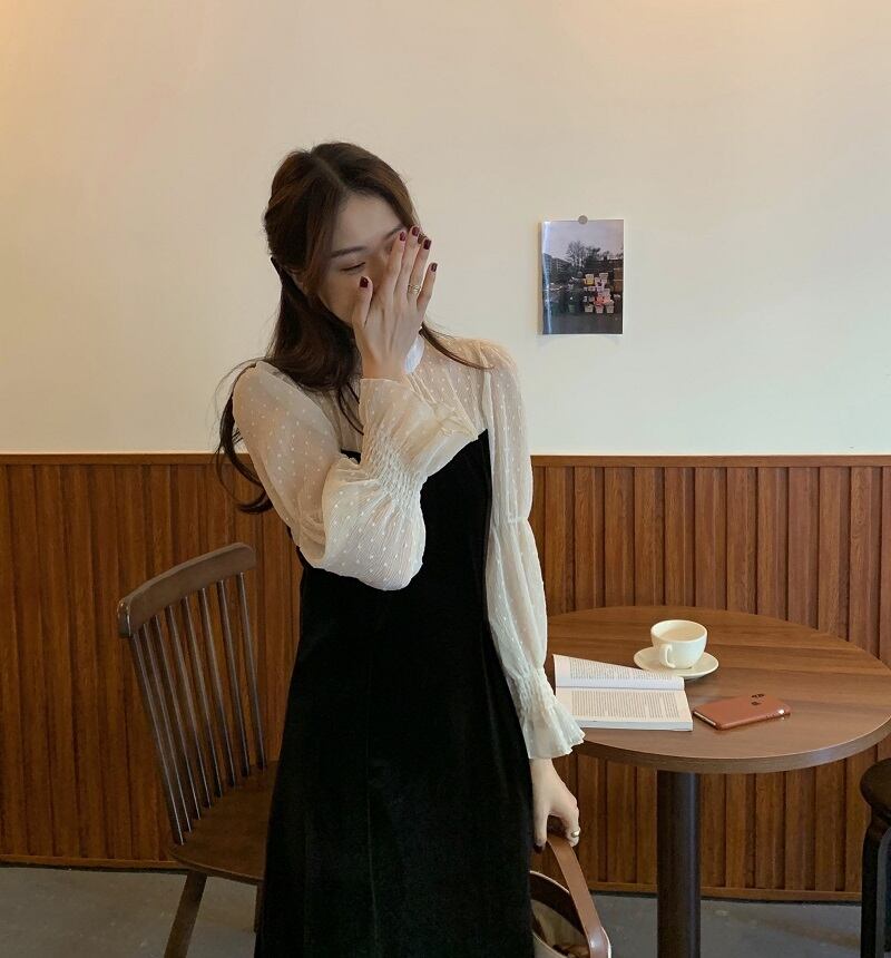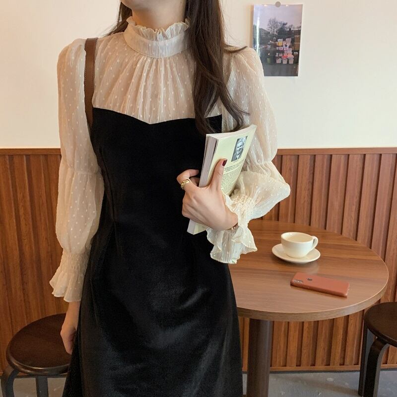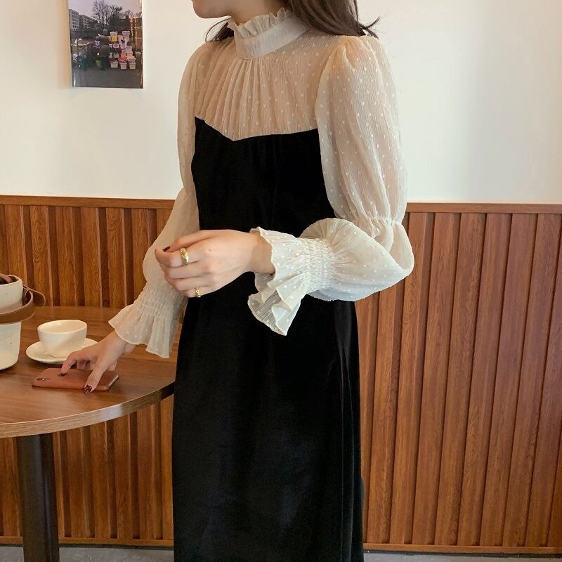 重ね着風 フェイクレイヤード シアー フリルネック ジュリエットスリーブ ワンピース ワンピドレス 膝下 ミモレ丈 ミディアム丈 長袖 ボリューム袖 襟付き スタンドカラー Aライン 切り替えデザイン ドッキング 異素材MIX ベルベット 大人可愛い きれいめ シンプル 上品 おしゃれ ガーリー エレガント 無地 秋 冬 謝恩会 二次会 レディース ママ パーティー イベント レストラン 韓国系 オルチャン コーデ 大きいサイズ ブラック