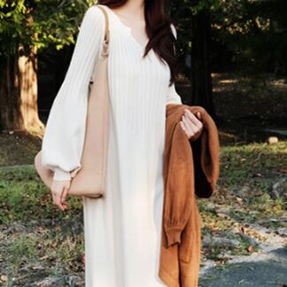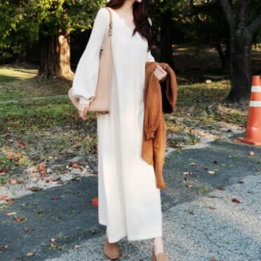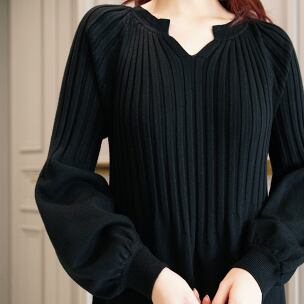 ニットワンピース トップス ニット シンプル ブラック 黒 アプリコット ミドル丈 ロング丈 袖あり 長袖 ボリューム袖 ランタンスリーブ Vネック 大人女子 大人 上品 おしゃれ きれいめ シンプル デイリーウェア レトロ レトロ風 こなれ感 ルーズ シルエット ラフ 個性的 デザイン 主役級 存在感 無地 秋 オータム 20代 10代 30代 レディース 女性用 マタニティ 着回し 普段使い ワンサイズ S M L XL M L XL 大きいサイズ 2XL 3XL