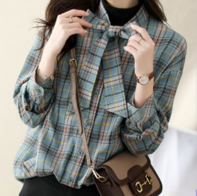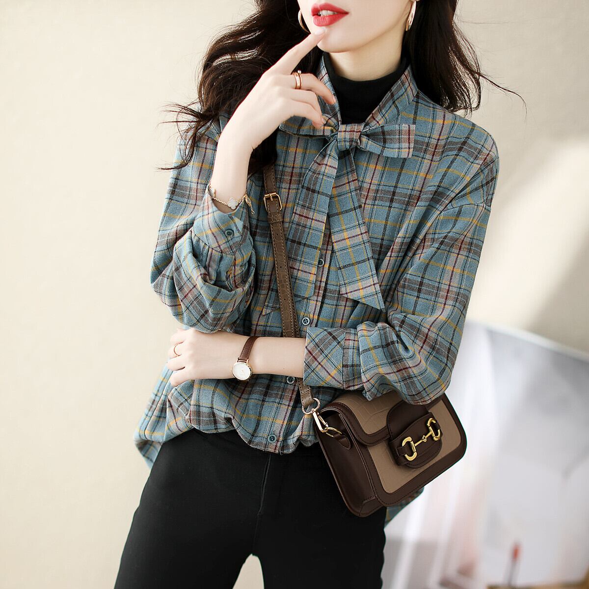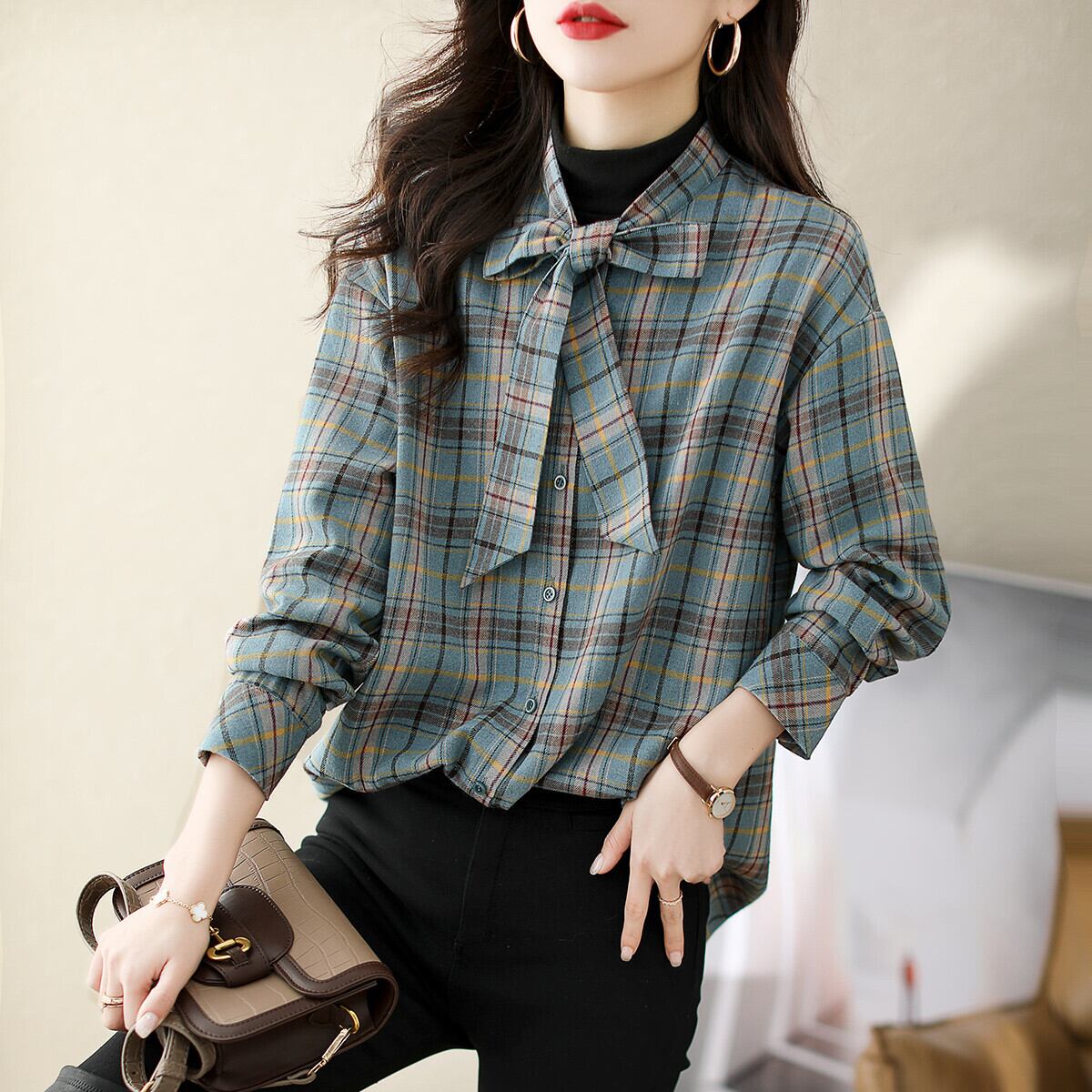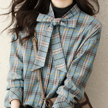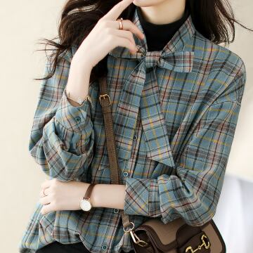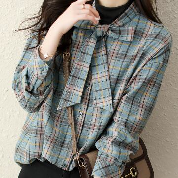 リボンタイシャツ トップス シャツ ブラウス カジュアル レギュラー丈 袖あり 長袖 ストレート シングルブレスト ボタン ポリエステル 大人女子 大人 上品 おしゃれ デイリーウェア レトロ レトロ風 こなれ感 ルーズ シルエット ラフ キュート かわいい 女子 個性的 デザイン 主役級 存在感 柄 チェック柄 春 スプリング 20代 10代 30代 40代 レディース 女性用 オフィス ビジネス OL 通勤 学生 学校 通学 着回し 普段使い S M L XL