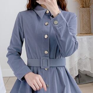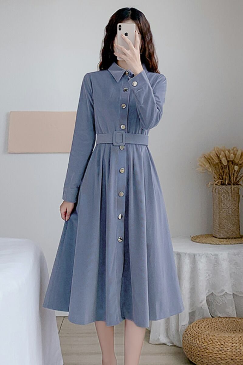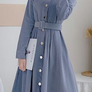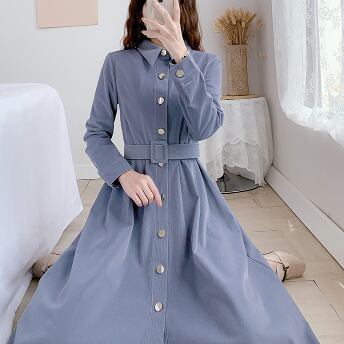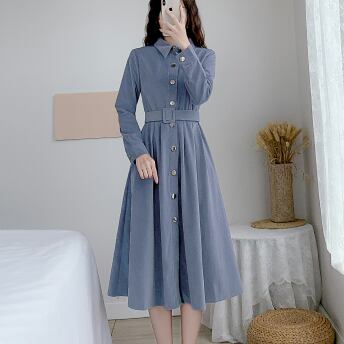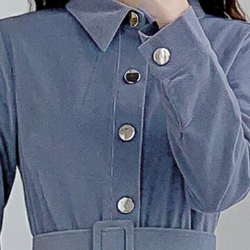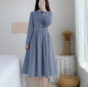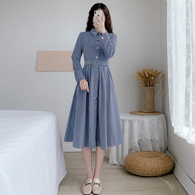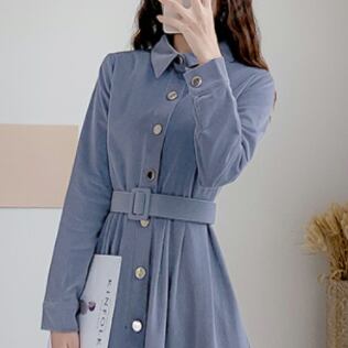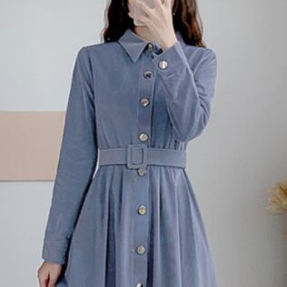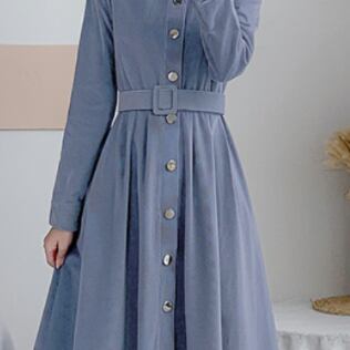 コーデュロイワンピース トップス シャツ ブラウス クラシック ブルー 青 ミドル丈 袖あり 長袖 襟付き スリム 細身 タイト シングルブレスト ボタン ベルト 大人女子 大人 上品 おしゃれ きれいめ シンプル デイリーウェア レトロ レトロ風 こなれ感 個性的 デザイン 主役級 存在感 無地 春 スプリング 秋 オータム 20代 10代 30代 40代 レディース 女性用 オフィス ビジネス OL 通勤 学生 学校 通学 美脚 足長 S M L XL 2XL