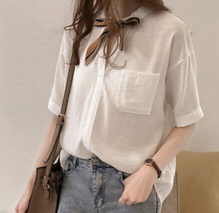リボンネクタイ付き半袖ブラウス トップス シャツ ブラウス ロング丈 半袖 Vネック ワイド リボン ポケット 綿 薄手 お得 かわいい 大人可愛い きれいめ シンプル カジュアル 大人 上品 おしゃれ かっこいい 大人女子 こなれ感 ラフ ルーズ 無地 春 夏 10代 20代 30代 40代 50代 60代 ママ 女の子 オフィス OL 通勤 学生 通学 デート お出かけ 女子会 休日 リゾート 旅行 着回し 普段使い ファッション コーデ 楽ちん モテ 定番 M L XL 2XL 3XL 4XL