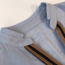 このブラウスには、さりげなくリボンをつけてフェミニンな印象に。Vネックとワイドシルエットで縦のラインを強調し、スタイルアップにも一役買います。ロング丈で腰回りもカバーし、おしゃれに見える春夏の着こなしに欠かせません。