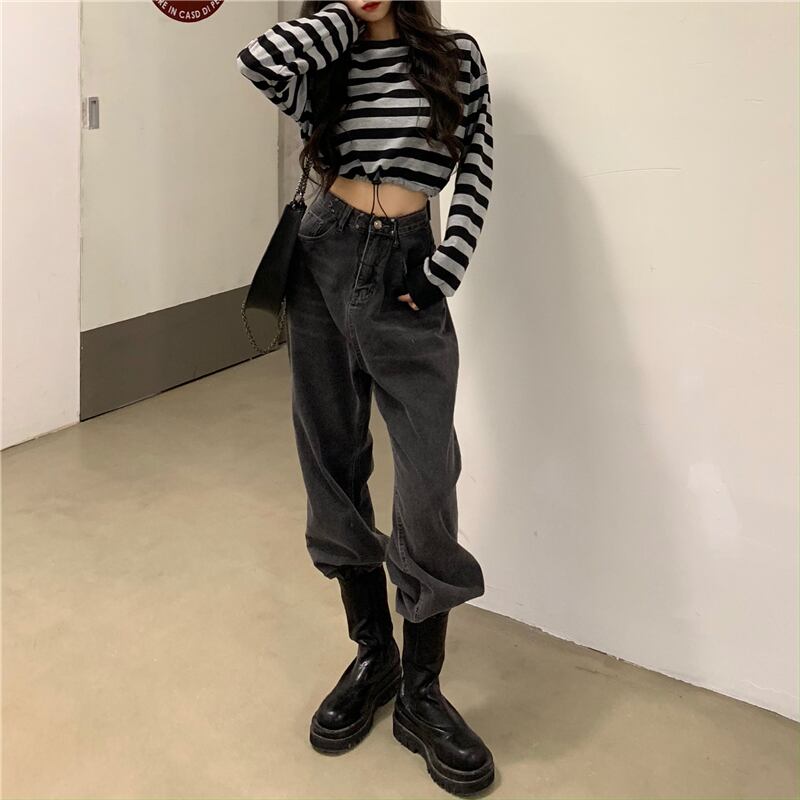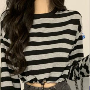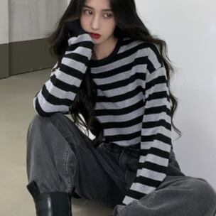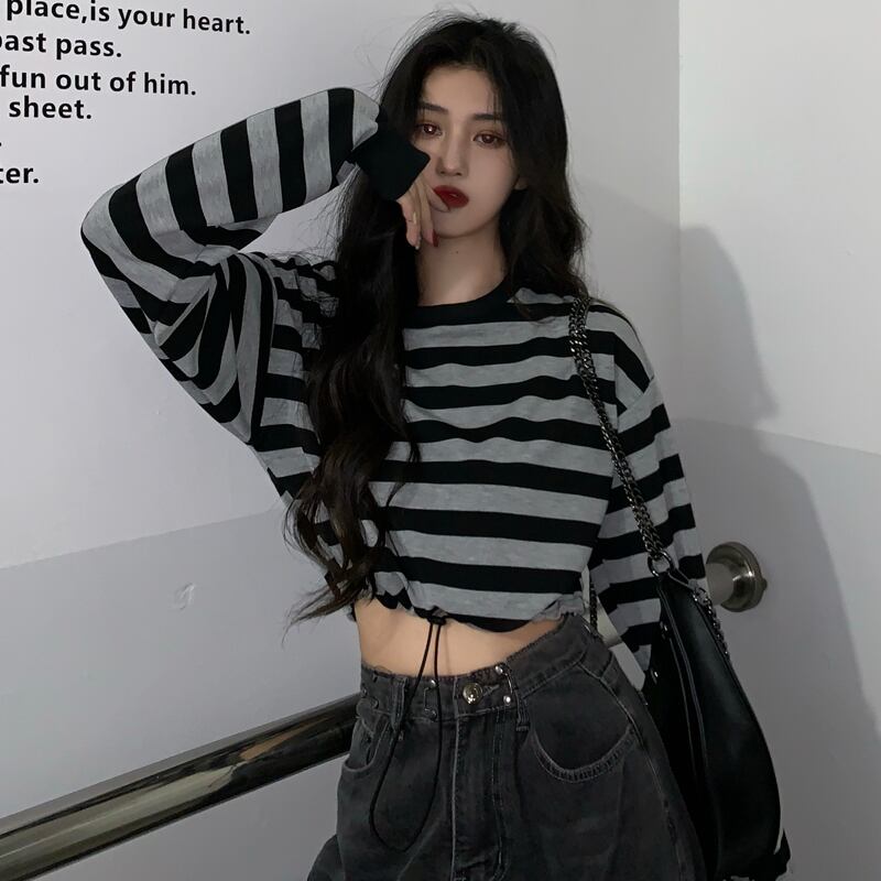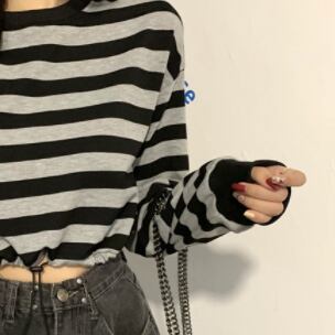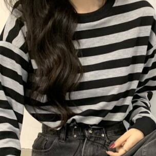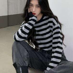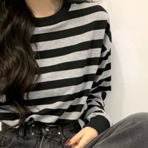 ショートストライプトレーナー トップス Tシャツ ショート 袖あり 長袖 ラウンドネック ハイウエスト 綿 かわいい 大人可愛い カジュアル 大人 おしゃれ かっこいい 大人可愛い 大人女子 こなれ感 ラフ マニッシュ ラブリー キュート 個性的 クール モード系 モダン 主役級 存在感 抜け感 ボーダー ストライプ 春 秋 10代 20代 30代 レディース 女性用 OL 学生 通学 デート お出かけ 公園デビュー 休日 着回し 普段使い ファッション コーデ スタイル モテ 体系カバー トレンド