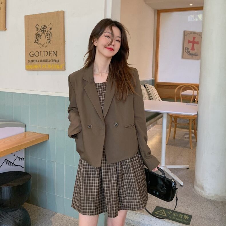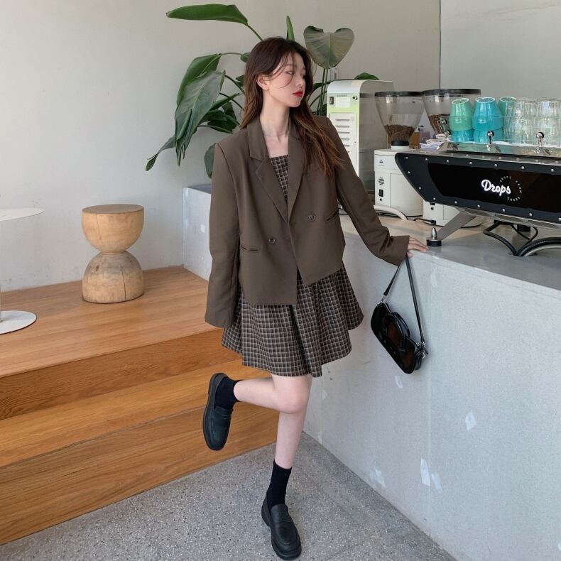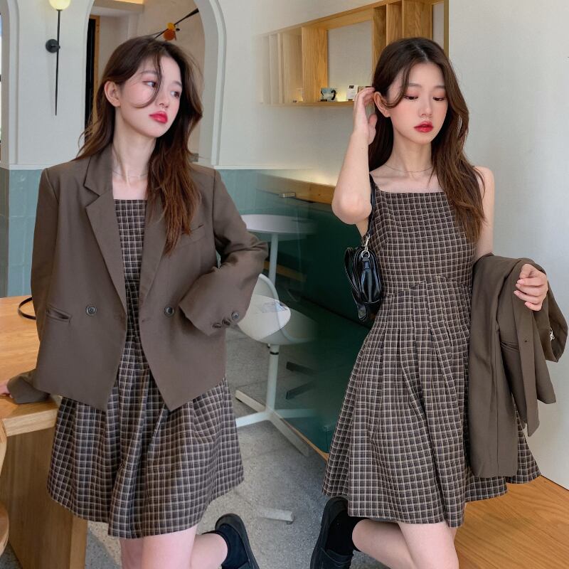 テーラードカラー ダブルボタン ジャケット ウエストシェイプ タックフレア キャミソールワンピ アウター ワンピース セットアップ 上着 フレアワンピース ミニ丈 膝上 ミディアム丈 ノースリーブ 長袖 襟付き 前開き 上下セット 2点セット ツーピース 大人可愛い きれいめ シンプル カジュアル 上品 レトロ 無地 チェック柄 格子柄 秋 冬 レディース 女の子 学生 通学 デート お出かけ 女子会 重ね着 韓国系 オルチャン スタイル S M L XL 2XL 3XL 大きいサイズ ブラウン