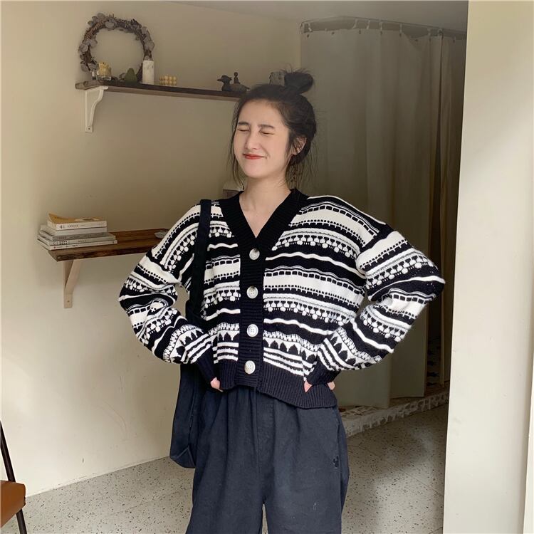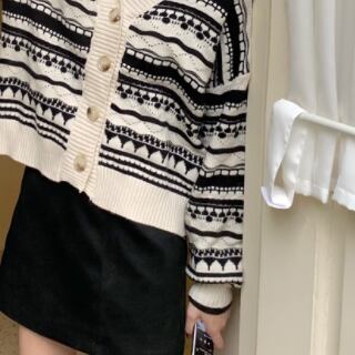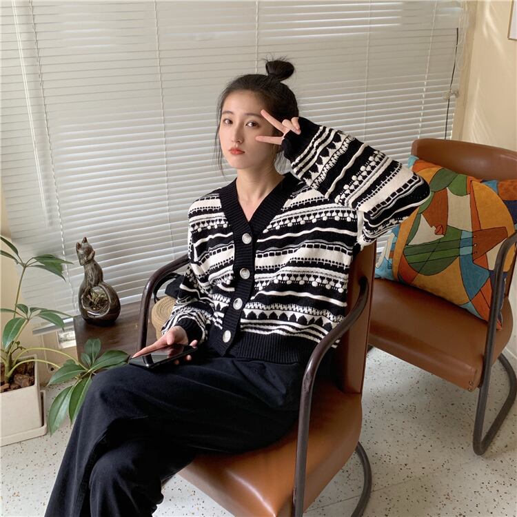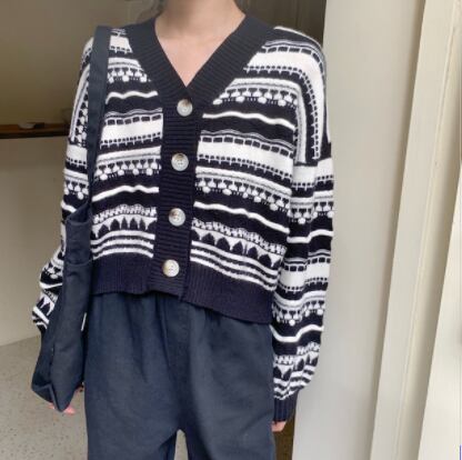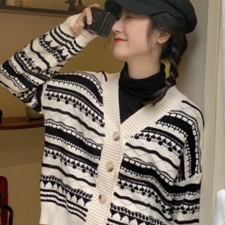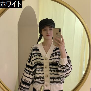 オーバーサイズ ボーダー風 ジャカード 羽織りもの トップス セーター カーディガン ショート丈 長袖 ドロップショルダー Vネック 前開き ニット かわいい 大人可愛い シンプル カジュアル 上品 おしゃれ お洒落 レトロ こなれ感 ルーズ 春 秋 冬 レディース ママ 女の子 学生 通学 お出かけ 女子会 休日 レストラン 普段使い 重ね着 着回し 韓国系 オルチャン ファッション コーデ スタイル 脚長 楽ちん 新作 フリーサイズ 大きめ ゆったり ゆる サイズ 白 ホワイト 黒 ブラック
