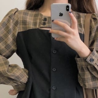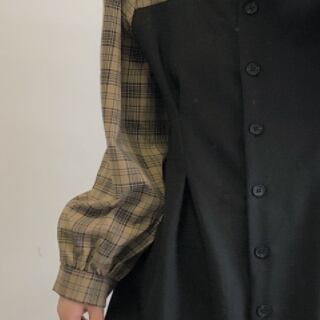 レトロな雰囲気のチェック柄ノーカラーブラウスに無地のビスチェワンピースを重ねているように見える、フロントボタンデザインのドッキングワンピース。