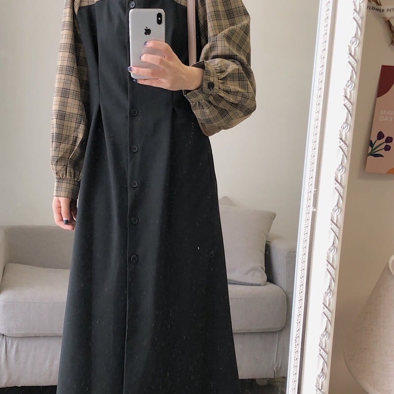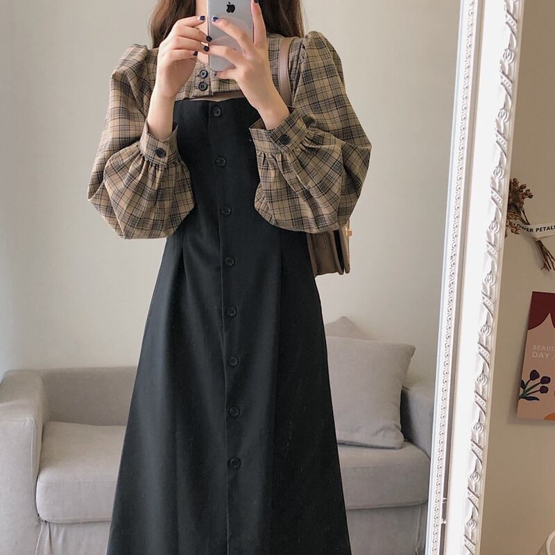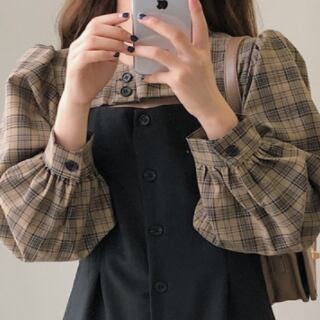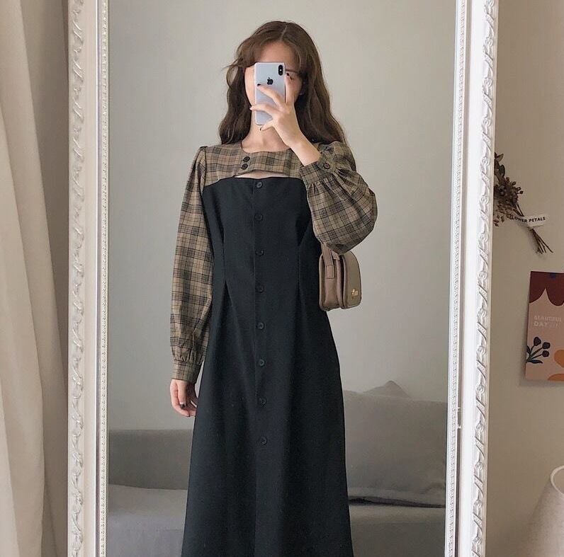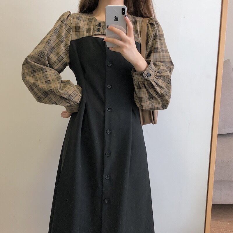 胸上カットアウト ウエストタック フロントボタン 重ね着風 フェイクレイヤード ワンピース 膝下 ミモレ丈 ミディアム丈 長袖 パフスリーブ Vネック Aライン 切り替えデザイン ドッキング 前開き かわいい 大人可愛い シンプル カジュアル 上品 おしゃれ レトロ 個性的 存在感 無地 チェック柄 格子柄 春 秋 レディース 女の子 学生 通学 デート お出かけ 女子会 休日 普段使い 韓国系 オルチャン ファッション コーデ M L XL 2XL 3XL 4XL 大きいサイズ 黒 ブラック