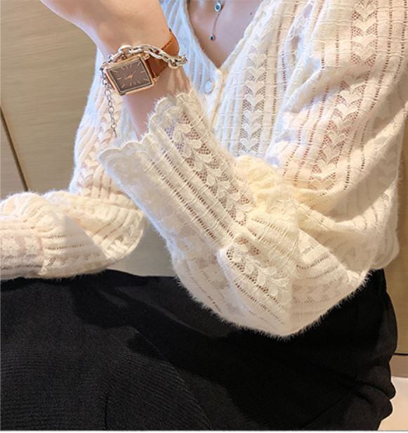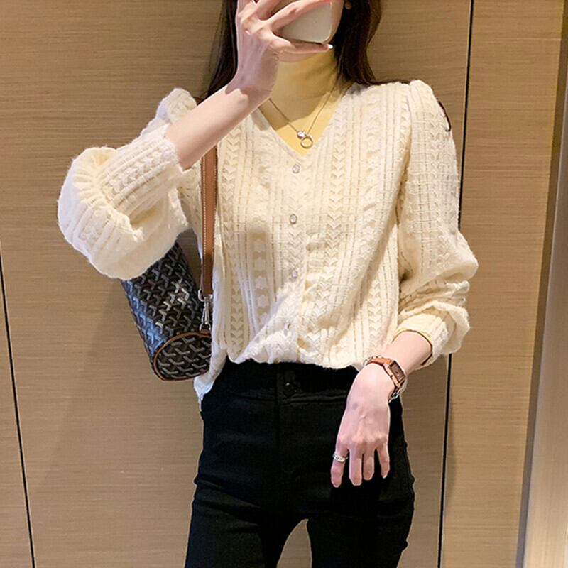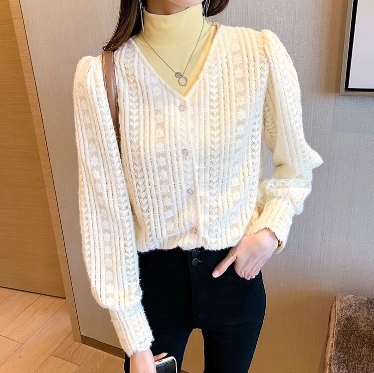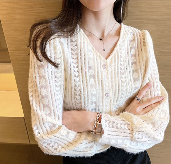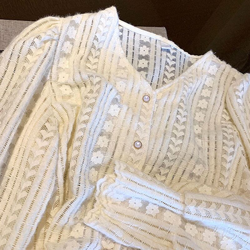 ストライプ風 ラインパターン レースシャツ ハート柄 フラワー柄 フロントボタン ロングカフス トップス ブラウス ミディアム丈 長袖 パフスリーブ Vネック 襟なし レース 前開き かわいい 大人可愛い きれいめ シンプル カジュアル 上品 おしゃれ お洒落 柄 花柄 春 秋 レディース 女性用 ママ 女の子 OL 通勤 学生 通学 デート お出かけ 女子会 休日 着回し 普段使い 重ね着 韓国系 オルチャン ファッション スタイル M L XL 2XL 3XL 4XL 大きいサイズ ベージュ