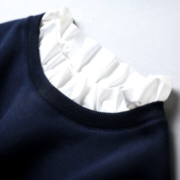 フリル付きセーターが、新登場です!柔らかで滑らかな生地感で、上品さも備えつつ、可愛らしいフリルがさりげなくアクセントになっています。縁取りのレース使いで、女性らしさを増してくれます。