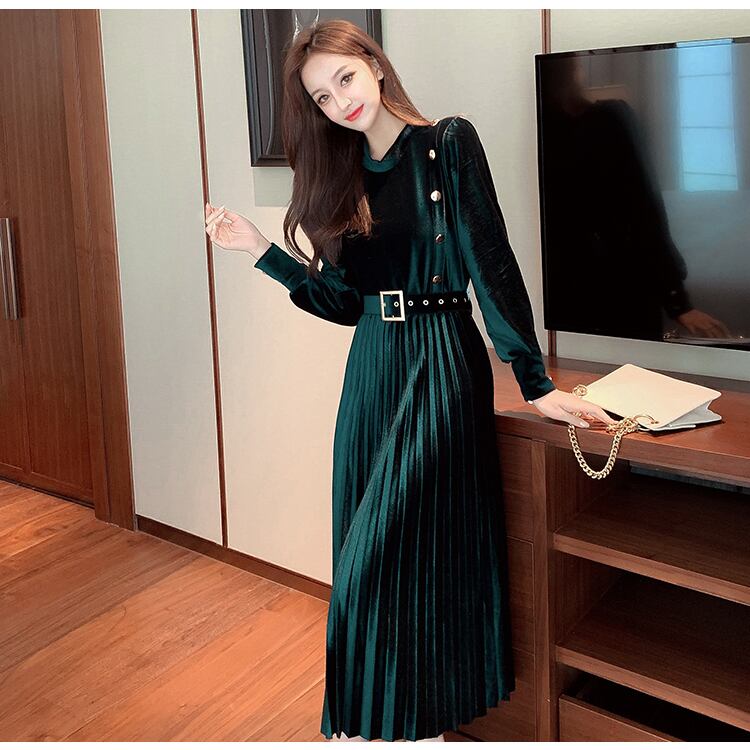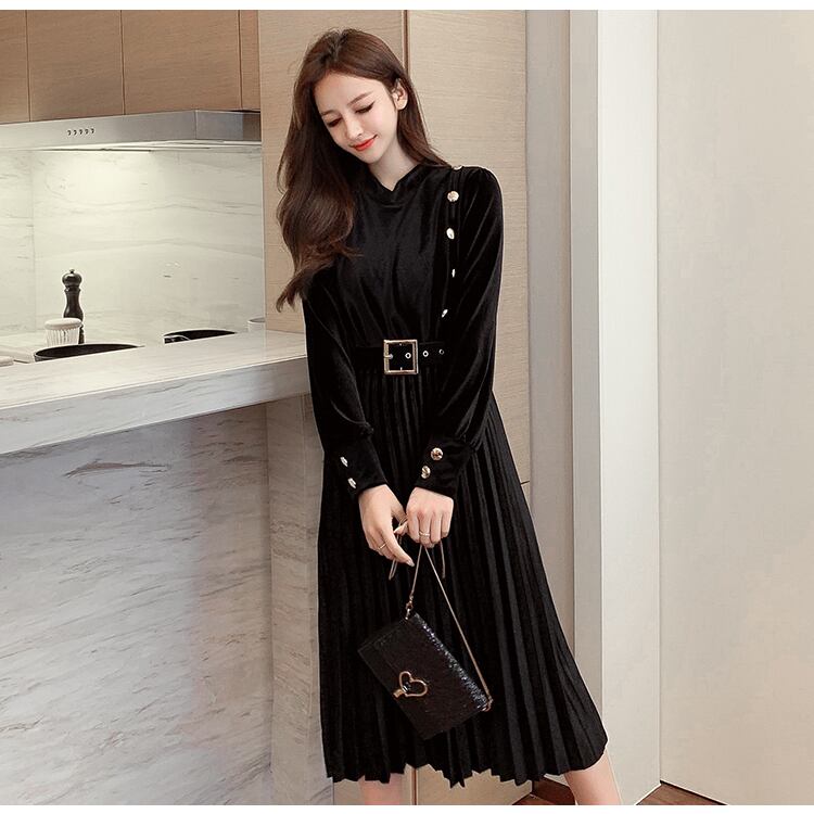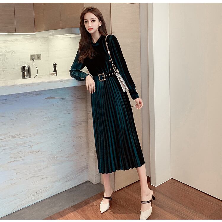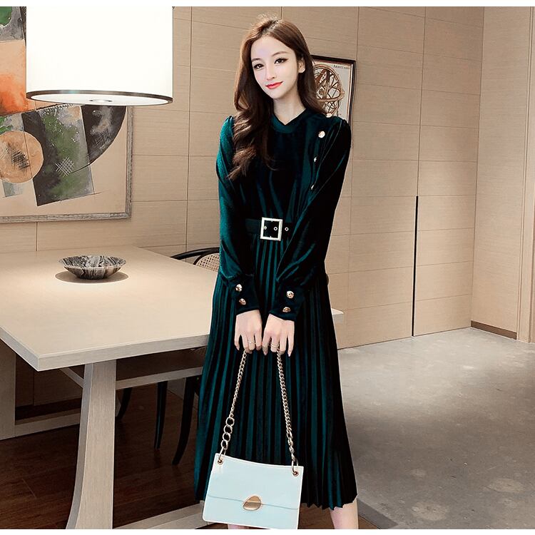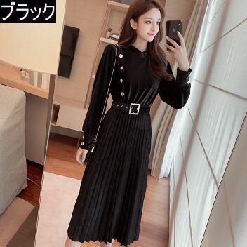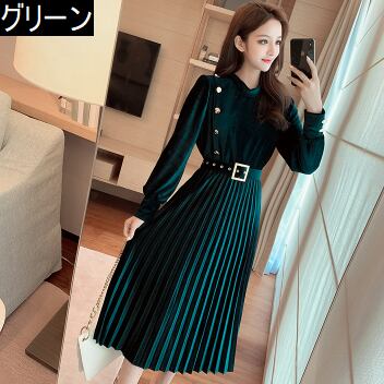プリーツワンピース クラシック スイート ブラック 黒 グリーン 緑 ミドル丈 袖あり 長袖 スリム 細身 タイト ボタン ベルト 大人女子 大人 上品 おしゃれ きれいめ シンプル エレガント デイリーウェア レトロ レトロ風 こなれ感 個性的 デザイン 主役級 存在感 無地 春 スプリング 20代 10代 30代 レディース 女性用 オフィス ビジネス OL 通勤 学生 学校 通学 デート お出かけ 女子会 食事会 ファッション コーデ S M L XL