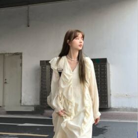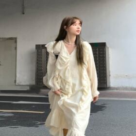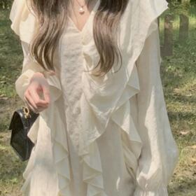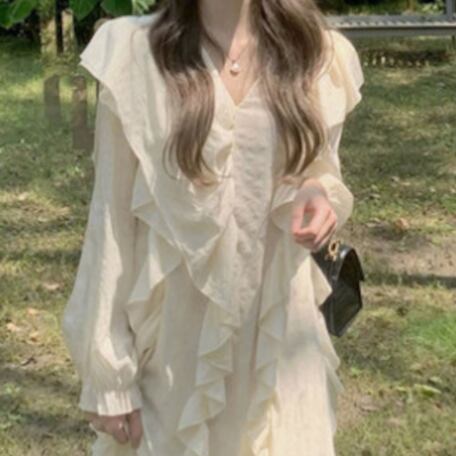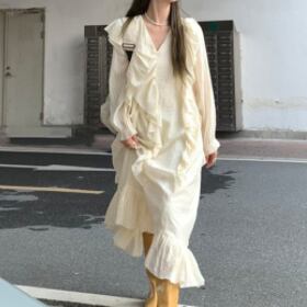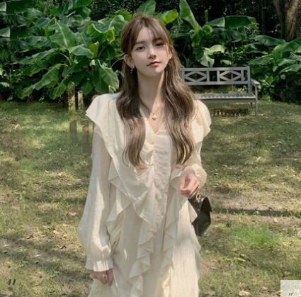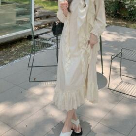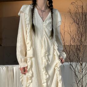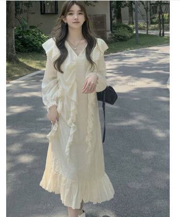 ロングワンピース トップス スイート ガーリー アプリコット ミドル丈 ロング丈 袖あり 長袖 Vネック フリル 綿 コットン 大人女子 大人 上品 おしゃれ デイリーウェア レトロ レトロ風 こなれ感 ルーズ シルエット ラフ キュート かわいい 女子 個性的 デザイン 主役級 存在感 無地 春 スプリング 20代 10代 30代 レディース 女性用 学生 学校 通学 デート お出かけ 女子会 食事会 ファッション コーデ 定番 細見え スタイル S M L XL