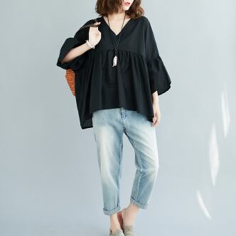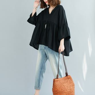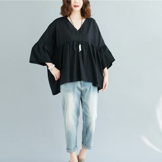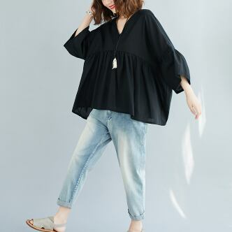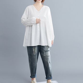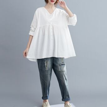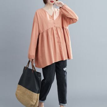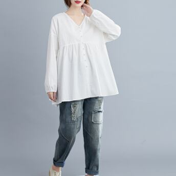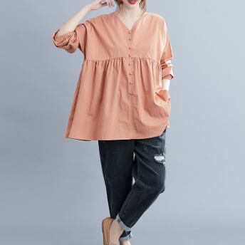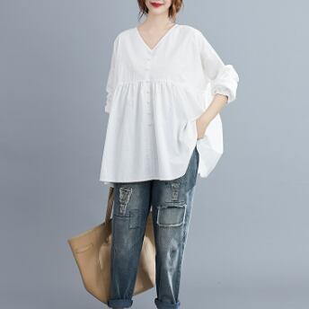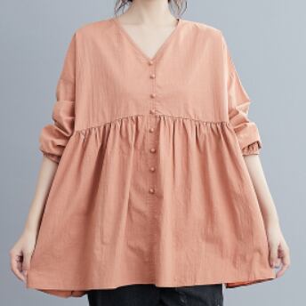 このVネックブラウスは、きれいめな着こなしが叶う一着です。綿素材でナチュラルな肌触りが魅力的で、フレアなシルエットが女性らしい表情を演出します。色展開は、ホワイト、ブラック、ピンクの3色から選べます。シンプルで飽きのこないデザインなので、10代から30代の幅広い年代の方におすすめです。