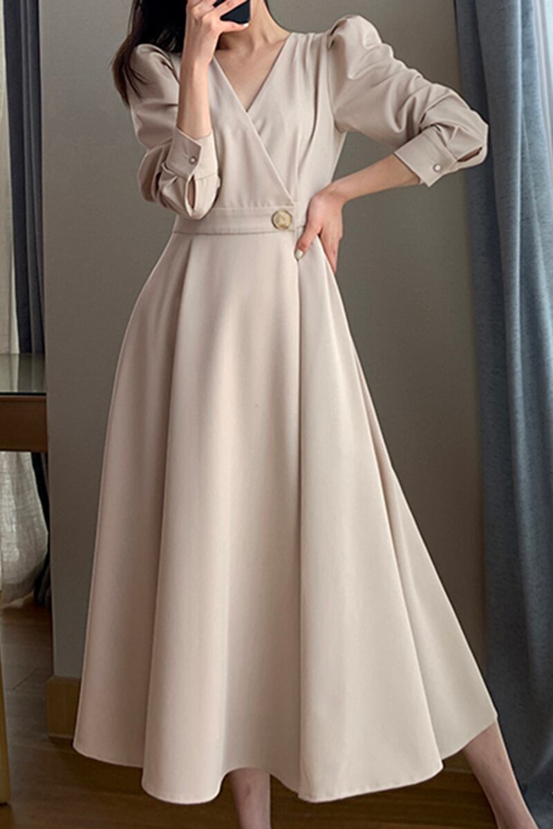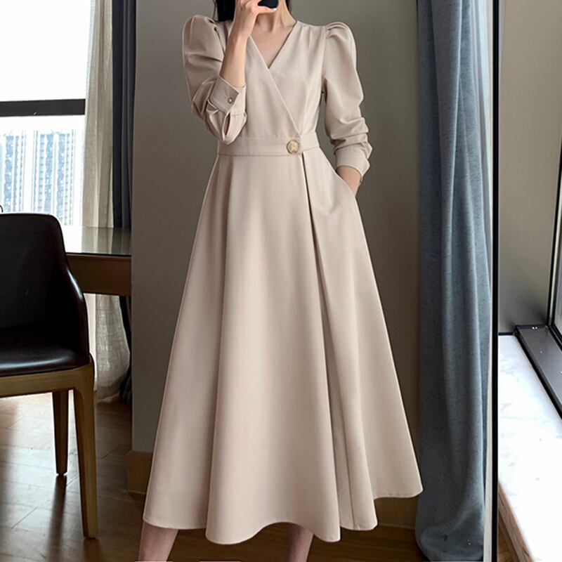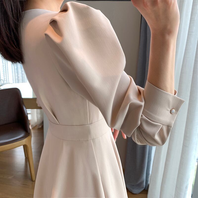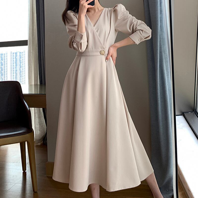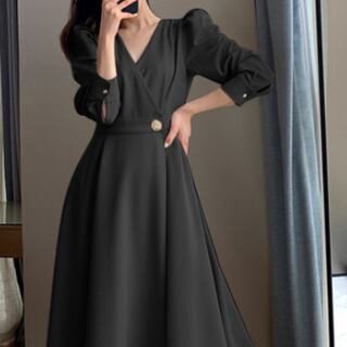 長袖ワンピース トップス クラシック シンプル ブラック 黒 アプリコット ミドル丈 袖あり 長袖 ボリューム袖 Vネック Aライン スリム 細身 タイト ベルト ポリエステル 大人女子 大人 上品 おしゃれ きれいめ シンプル エレガント レトロ レトロ風 こなれ感 個性的 デザイン 主役級 存在感 無地 秋 オータム 20代 30代 レディース 女性用 オフィス ビジネス OL 通勤 デート お出かけ 女子会 食事会 パーティ トレンド M L 大人カラー