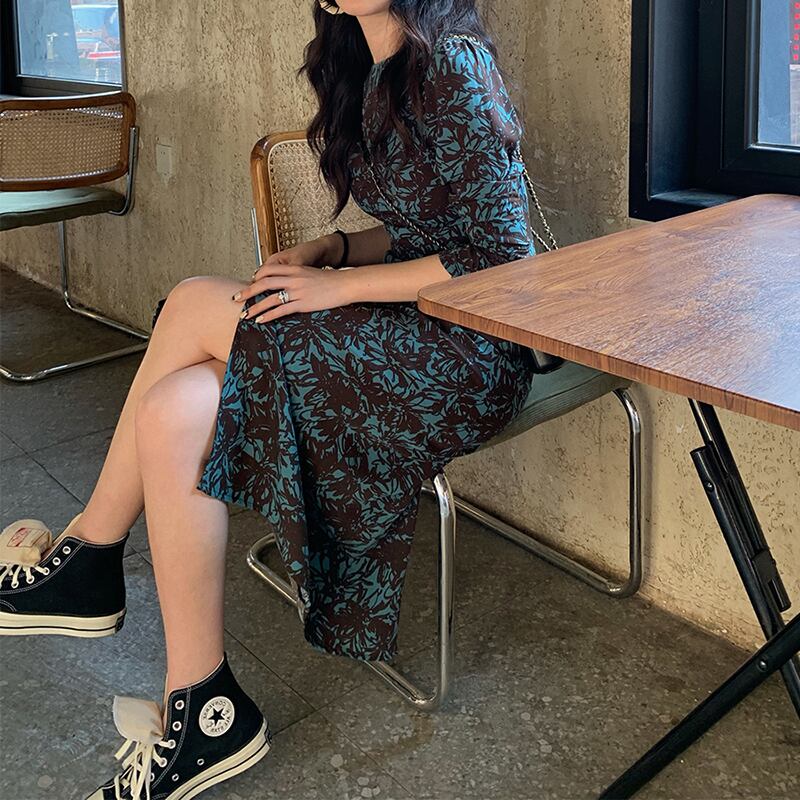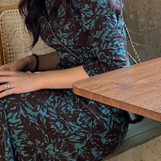華やかな大人女子を演出する、花柄ワンピースの登場です。モダンなデザインのブルー、グリーン、緑のくすみカラーが季節感を醸し出し、秋と春に最適。シャーリングとカットアウトのデザインが女性らしさを引き立て、ルーズなシルエットでこなれ感を出します。袖ありでありながら、肌を見せるカットアウトがエレガントな印象を与え、主役級の存在感を放ちます。