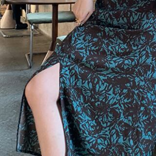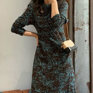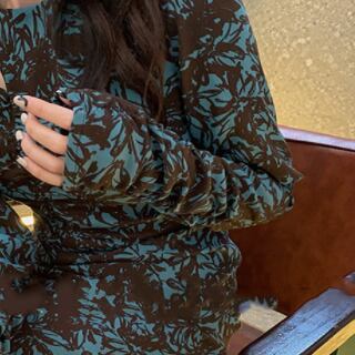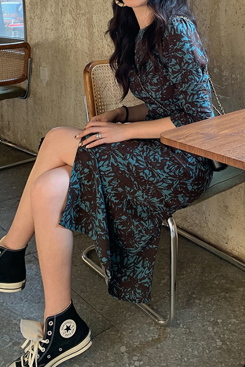 花柄ワンピース モダン ブルー 青 グリーン 緑 ミドル丈 袖あり 長袖 シャーリング スリット カットアウト くりぬき ポリエステル 大人女子 大人 上品 おしゃれ デイリーウェア レトロ レトロ風 こなれ感 ルーズ シルエット ラフ 個性的 デザイン 主役級 存在感 柄 花柄 フラワー 春 スプリング 秋 オータム 20代 30代 40代 レディース 女性用 デート お出かけ 女子会 食事会 M L XL 2XL 3XL 4XL くすみカラー 大きいサイズ