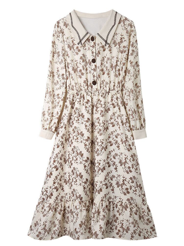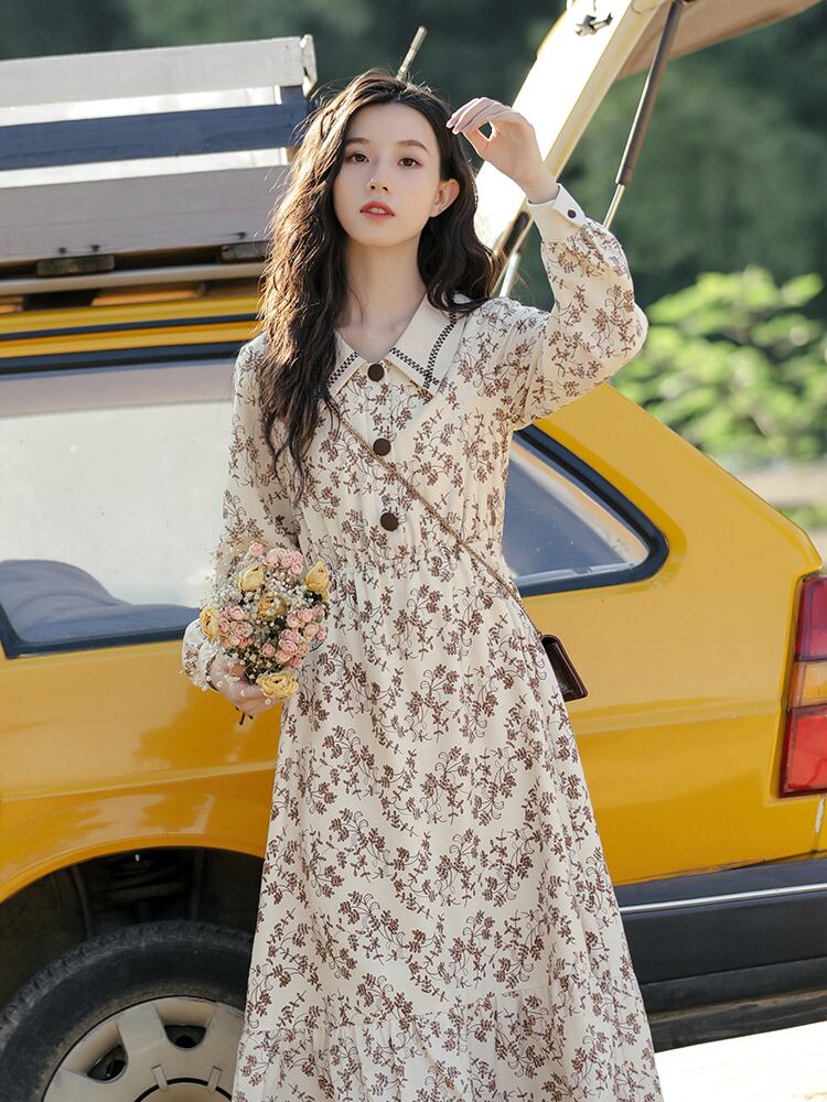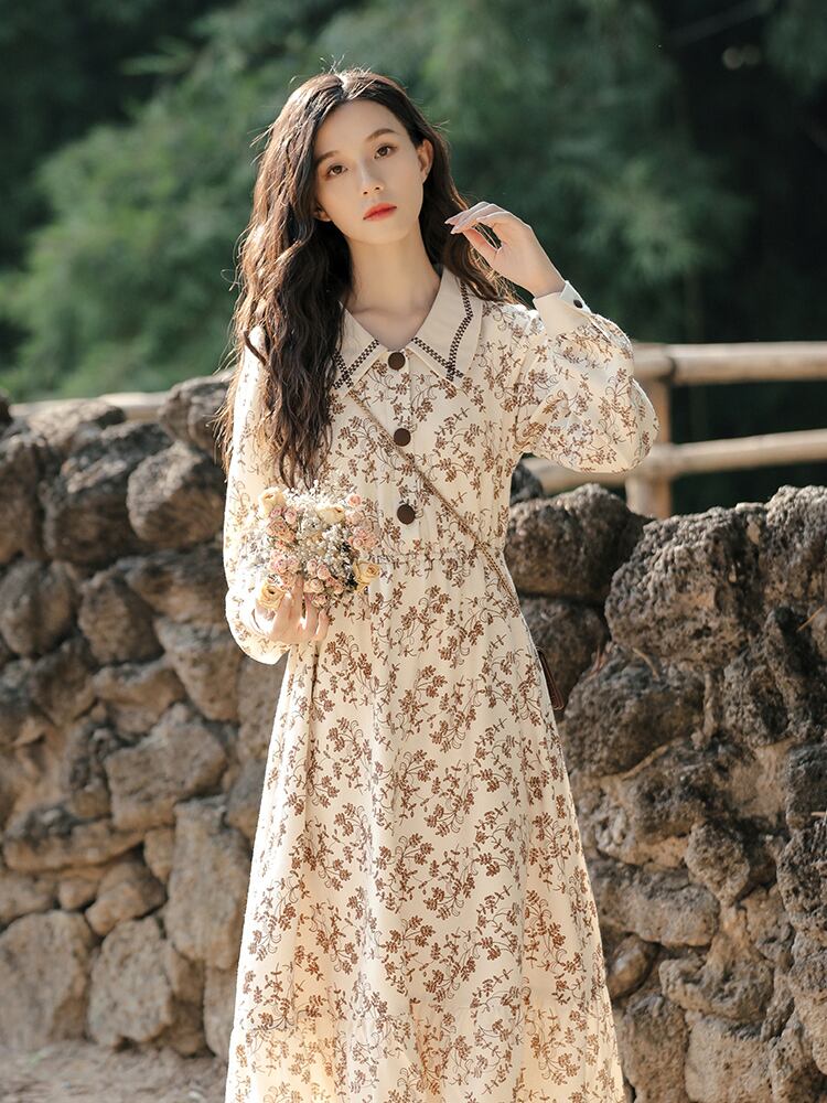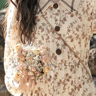 花柄ワンピース スイート ガーリー ミドル丈 袖あり 長袖 襟付き Aライン スリム 細身 タイト ボタン 大人女子 大人 上品 おしゃれ デイリーウェア レトロ レトロ風 こなれ感 キュート かわいい 女子 個性的 デザイン 主役級 存在感 柄 花柄 フラワー 春 スプリング 20代 10代 レディース 女性用 学生 学校 通学 デート お出かけ 女子会 食事会 着回し 普段使い モテ トレンド ファッション コーデ S M L ペールトーン 淡色