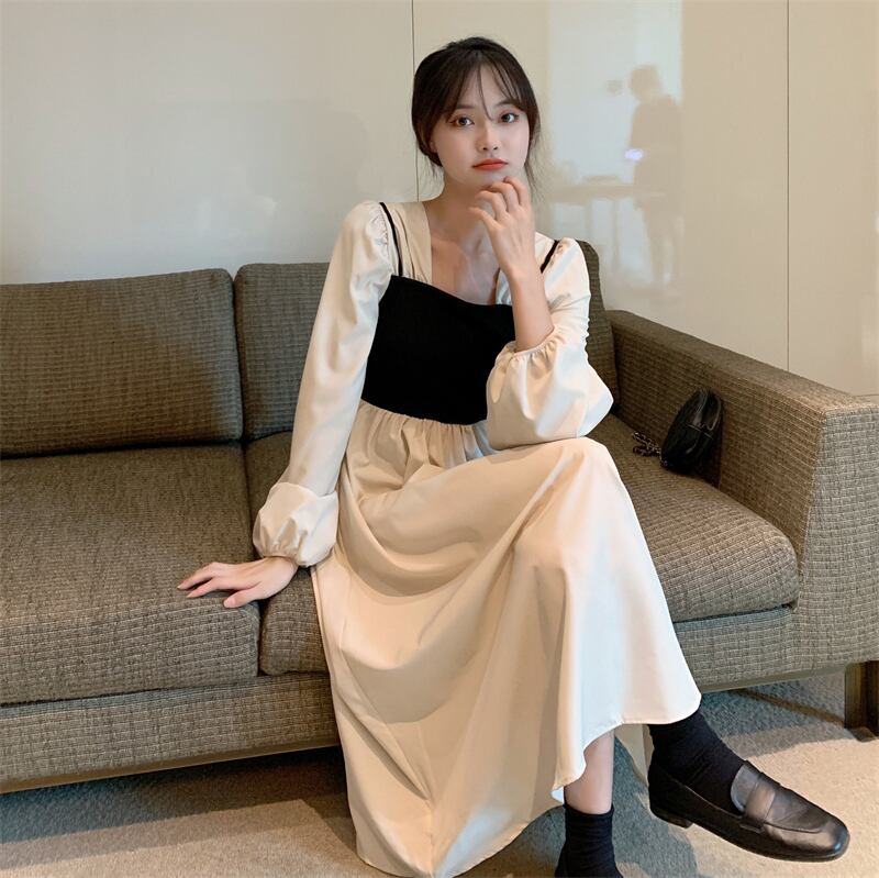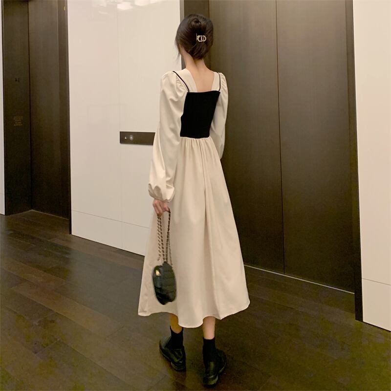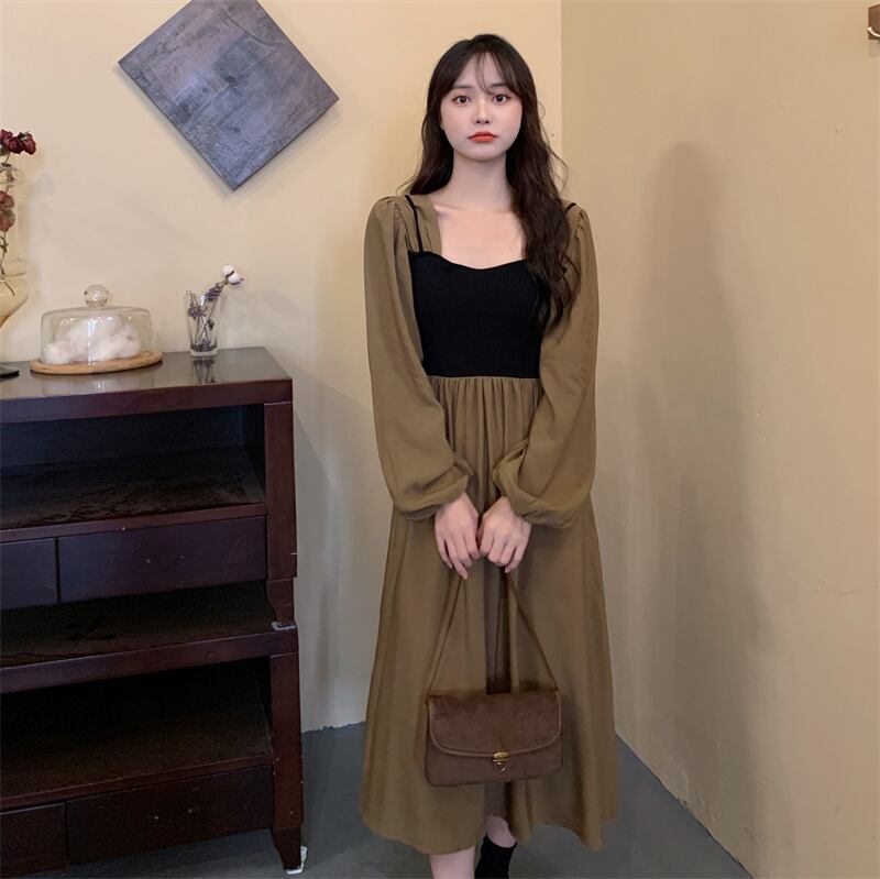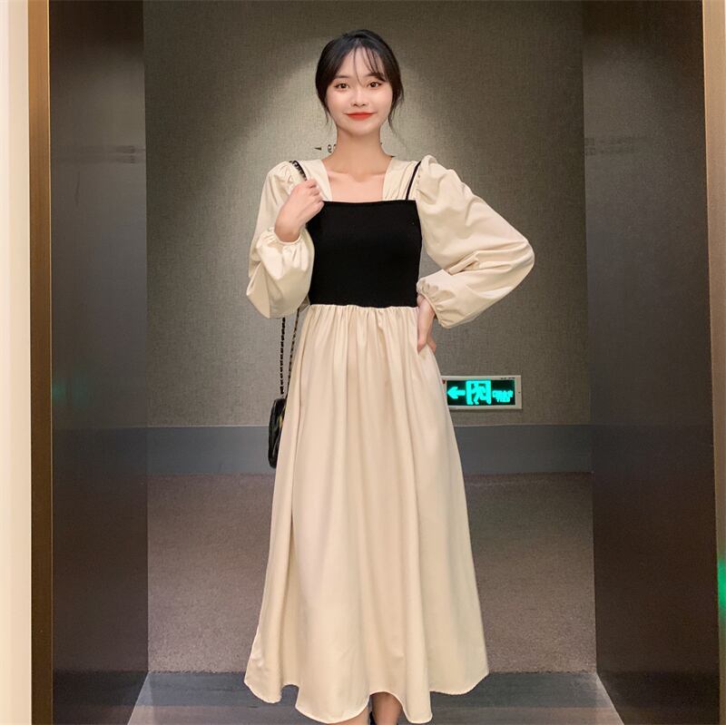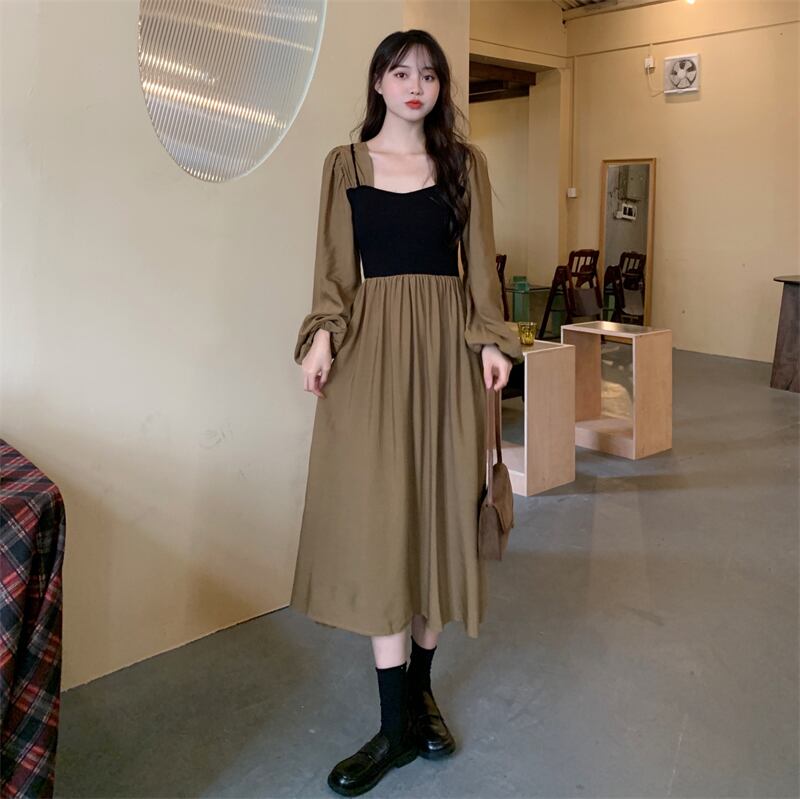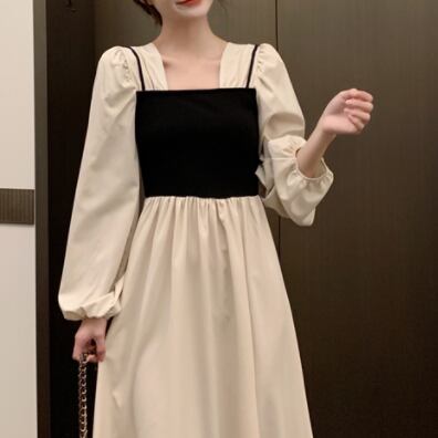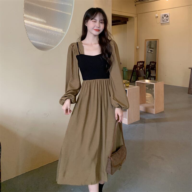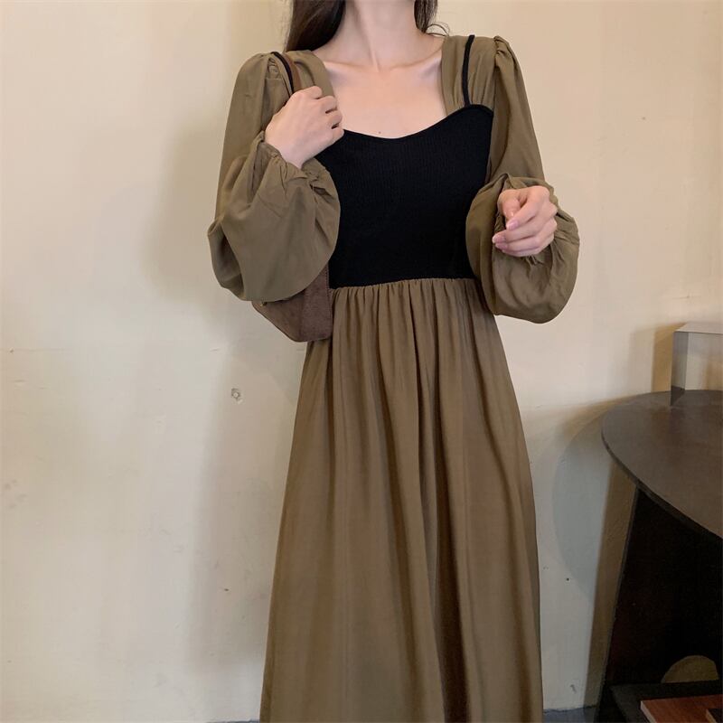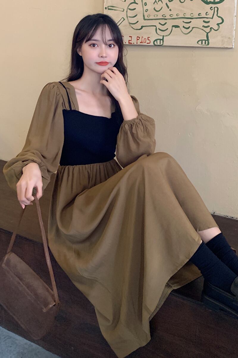 ビスチェ風ワンピース シンプル ブラウン 茶色 アプリコット ミドル丈 ロング丈 袖あり 長袖 スクエアネック フレア Aライン スリム 細身 タイト ポリエステル 大人女子 大人 上品 おしゃれ デイリーウェア レトロ レトロ風 こなれ感 個性的 デザイン 主役級 存在感 無地 配色 春 スプリング 秋 オータム 20代 10代 レディース 女性用 学生 学校 通学 着回し 普段使い M L XL 2XL 3XL 4XL バイカラー ツートーンカラー 大きいサイズ