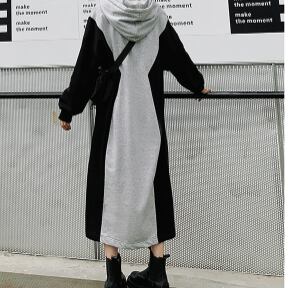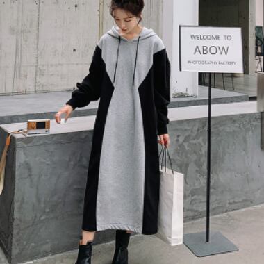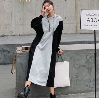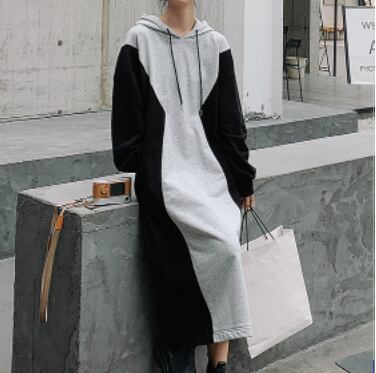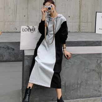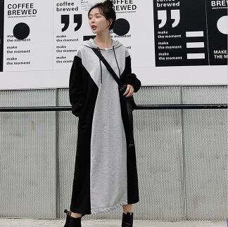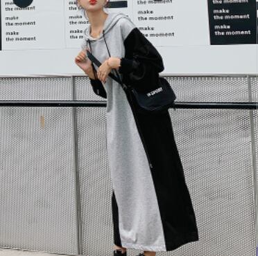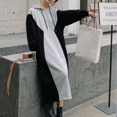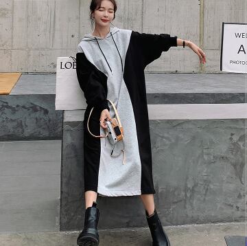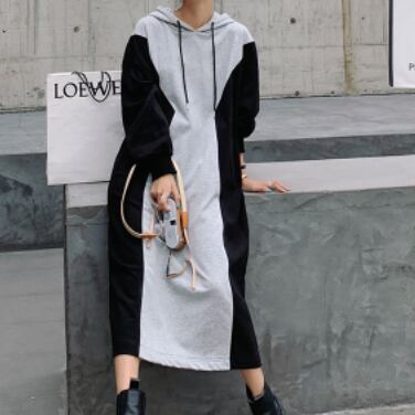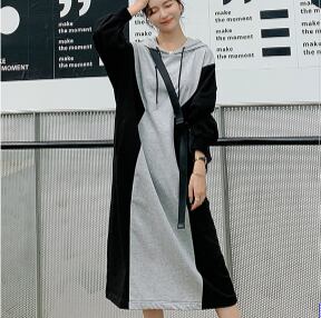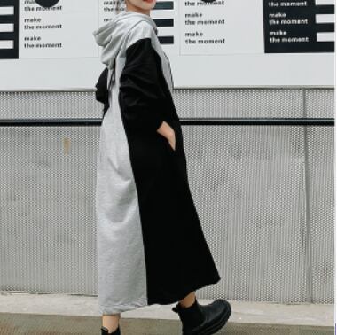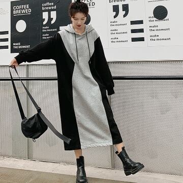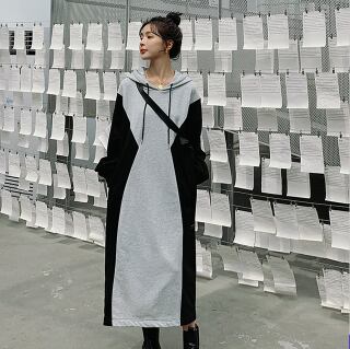 フード付きワンピース トップス シンプル ブラック 黒 グレー 灰色 ミドル丈 袖あり 長袖 フード ストレート ワイド 綿 コットン 大人女子 大人 上品 おしゃれ デイリーウェア レトロ レトロ風 こなれ感 ルーズ シルエット ラフ 個性的 デザイン 主役級 存在感 柄 配色 コントラストカラー 春 スプリング 20代 10代 30代 40代 レディース 女性用 休日 おうち らくちん 着回し 普段使い S M L XL バイカラー ツートーンカラー