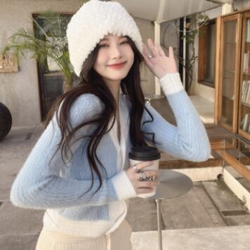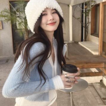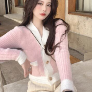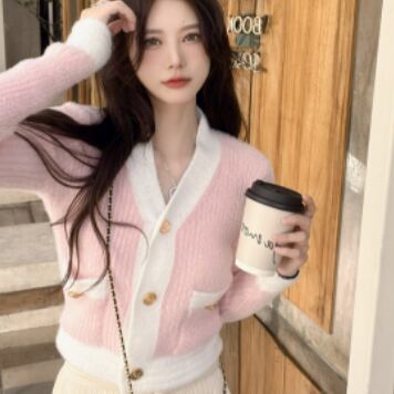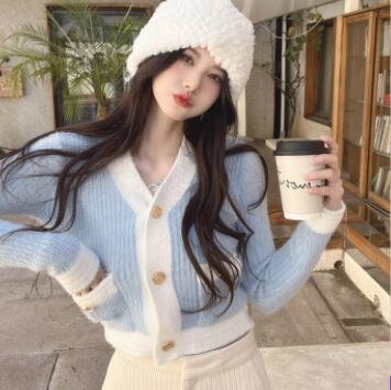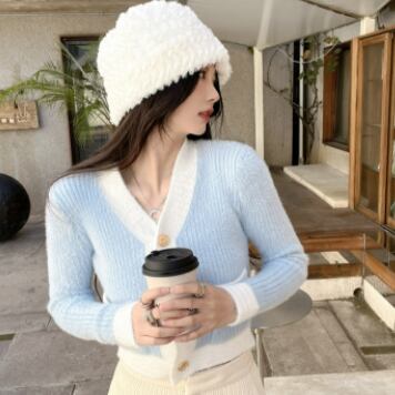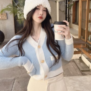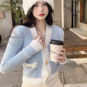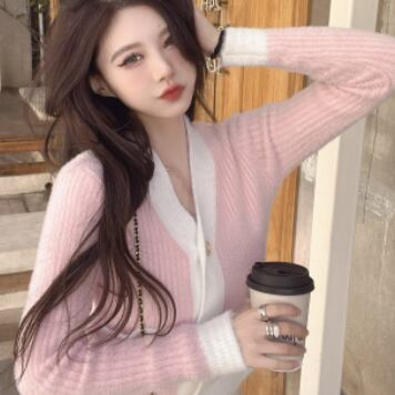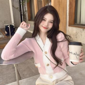 バイカラーカーディガン トップス ニット スイート ガーリー ブルー 青 ピンク ショート丈 袖あり 長袖 Vネック シングルブレスト ボタン 大人女子 大人 上品 おしゃれ デイリーウェア レトロ レトロ風 こなれ感 キュート かわいい 女子 個性的 デザイン 主役級 存在感 柄 配色 コントラストカラー 秋 オータム 冬 ウインター 20代 10代 レディース 女性用 学生 学校 通学 デート お出かけ 女子会 食事会 重ね着 レイヤード ワンサイズ
