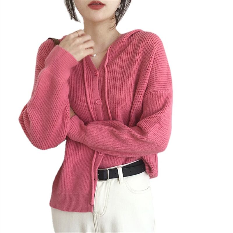 Vネック仕様で顔周りをすっきり見せるフード付きニットカーディガン♪