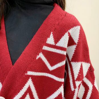 大きめの幾何学模様が存在感抜群のニットカーディガンです。