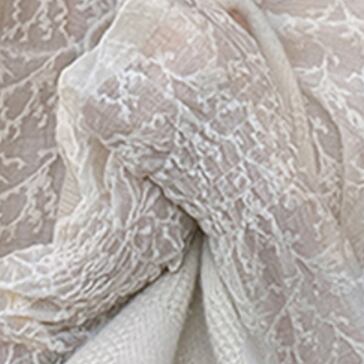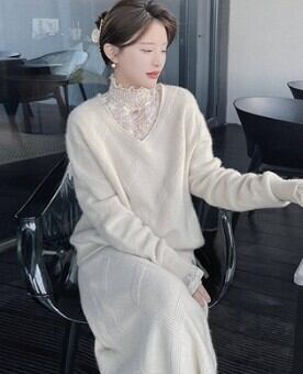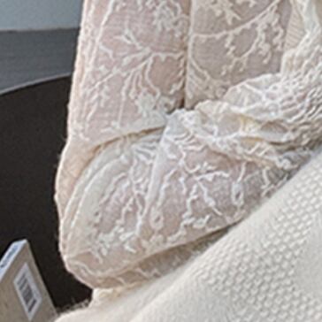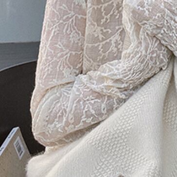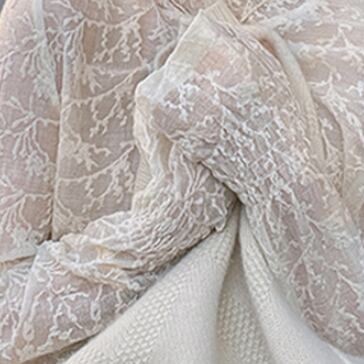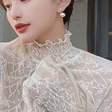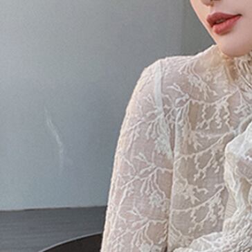 今季必須アイテムのトップスです。胸元から首元を華奢に見せるハイネックに、レースと刺繍が施された上品で可愛らしいデザインになっています。さらに、透け感があるシフォン素材が、女性らしさを引き立てます。