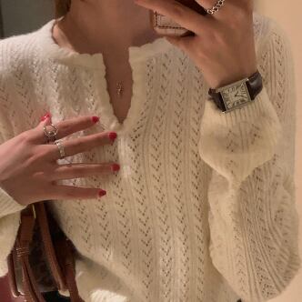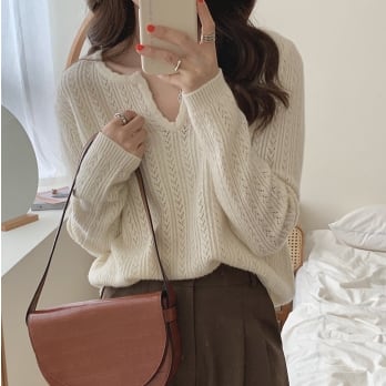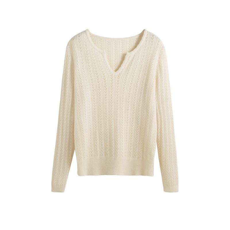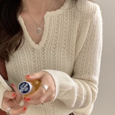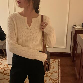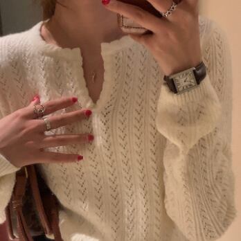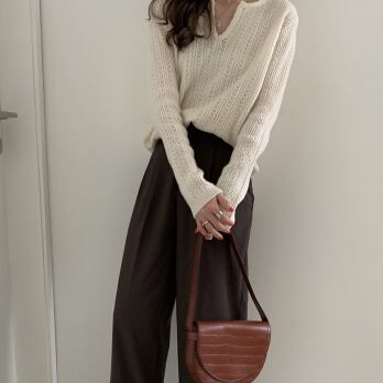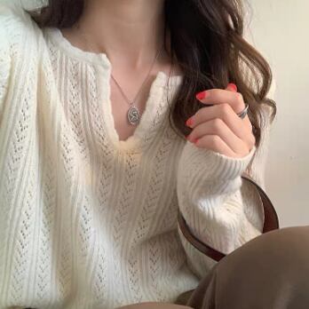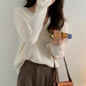 軽やかなクロシェ編みが魅力のVネックニットセーター。ミディアム丈で、膝上丈のスカートや細いパンツと相性抜群です。シンプルながら、クロシェ編みのディテールがポイント。爽やかでエレガントな印象のアイテムです。