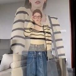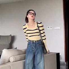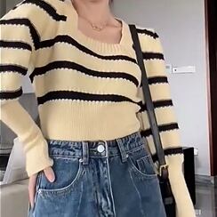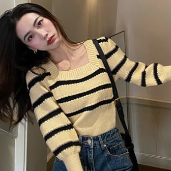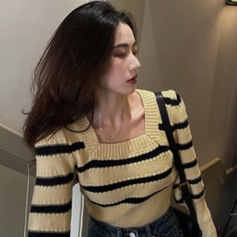 <スクエアネックデザインでオシャレに着こなせるリブニットセーター> -||- ファッションアイテムにこだわりを持つあなたに捧げる、スタイリッシュなスクエアネックリブニットセーター。デザインは無駄を省いたシンプルなショート丈と細身のシルエットで、タイトスカートやハイウエストパンツとの相性も抜群です。リブ編みの素材が、体形をカバーしながらも女性らしさを引き出してくれます。また、長袖で襟なし、そしてストライプ柄で幅広いスタイルにマッチする優秀アイテム。春秋シーズンはもちろん、コーデの幅を広げたい休日や旅行先まで活躍してくれることでしょう。是非お気に入りの一枚として、着回しのしやすいコーディネートスタイルをお楽しみください。