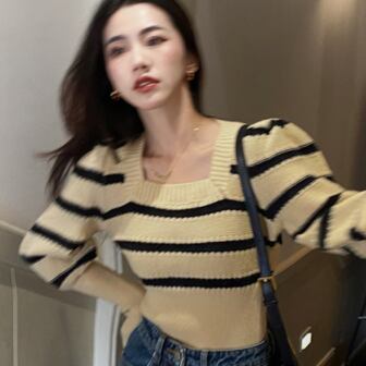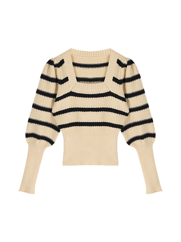 スクエアネックリブニットセーター トップス セーター ショート ショート丈 袖あり 長袖 レッグオブマトンスリーブ スクエアネック 襟なし スリム タイト 細身 ハイウエスト リブ リブニット ニット かわいい 大人可愛い きれいめ カジュアル 大人 上品 おしゃれ かっこいい 大人可愛い 大人女子 こなれ感 ラブリー キュート 個性的 クール モード系 エレガント モダン 主役級 存在感 抜け感 ストライプ 春 秋 レディース 休日 旅行 着回し 普段使い ファッション コーデ スタイル 体系カバー