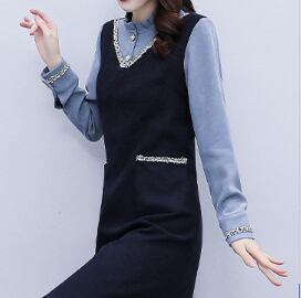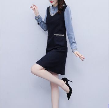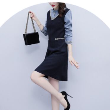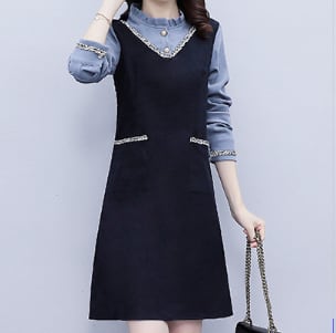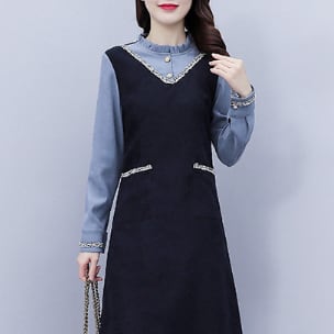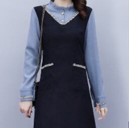 重ね着風 フェイクレイヤード ミックスカラーライン V字切替え 袖口シャーリング フリルネック ワンピース ミディアム丈 ひざ丈 膝下丈 長袖 襟付き スタンドカラー Aライン 切り替えデザイン ドッキング 異素材MIX ポリエステル かわいい 大人可愛い シンプル きれいめ 上品 おしゃれ お洒落 エレガント 無地 春 秋 レディース 女の子 オフィス OL 通勤 学生 通学 デート お出かけ 女子会 レストラン 普段使い 韓国系 オルチャン コーデ スタイル 体系カバー S M L XL ネイビー