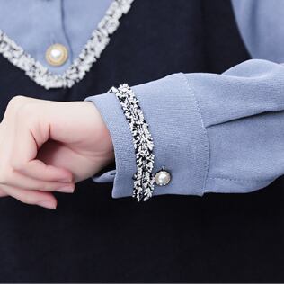 重ね着風のフェイクレイヤードワンピースで、おしゃれな着こなしを楽しみましょう。特徴的なV字切替えと混ざり合うミックスカラーラインが、エレガントで上品な印象を与えます。袖口のシャーリングとフリルネックが可愛さをプラス。スタンドカラーのデザインなので、ネックレスも主張できます。Aラインシルエットで、スタイルアップ効果もしっかりあります。ドッキング素材の異素材MIXで、上品ながらも抜け感があるところも魅力の一つ。ポリエステル素材なので、シワになりにくくお手入れもラクラクです。春から秋まで長く活躍するアイテムとして、ぜひ取り入れてください。適正サイズをお選びいただくことで、体系カバーにもつながる便利な一枚です。