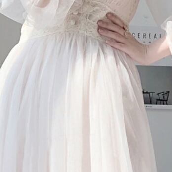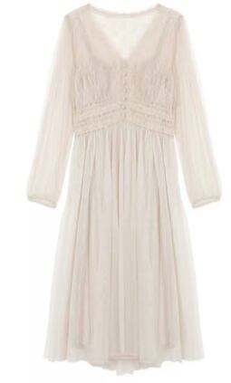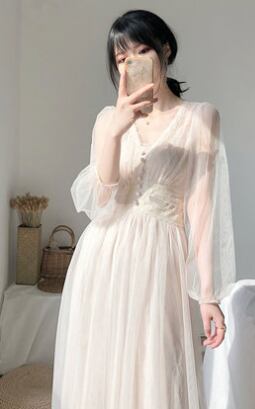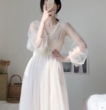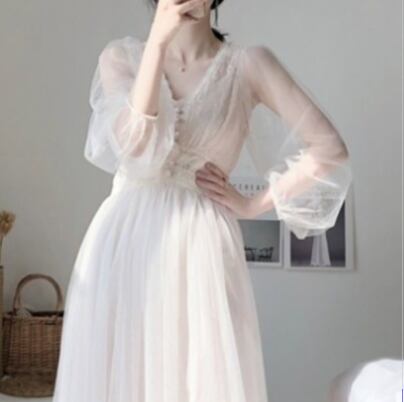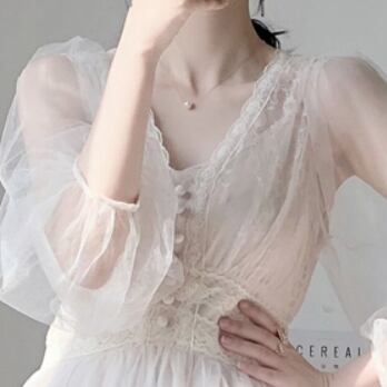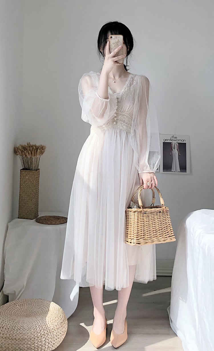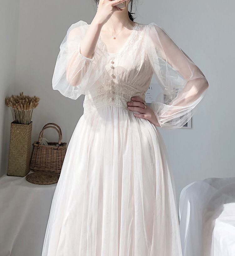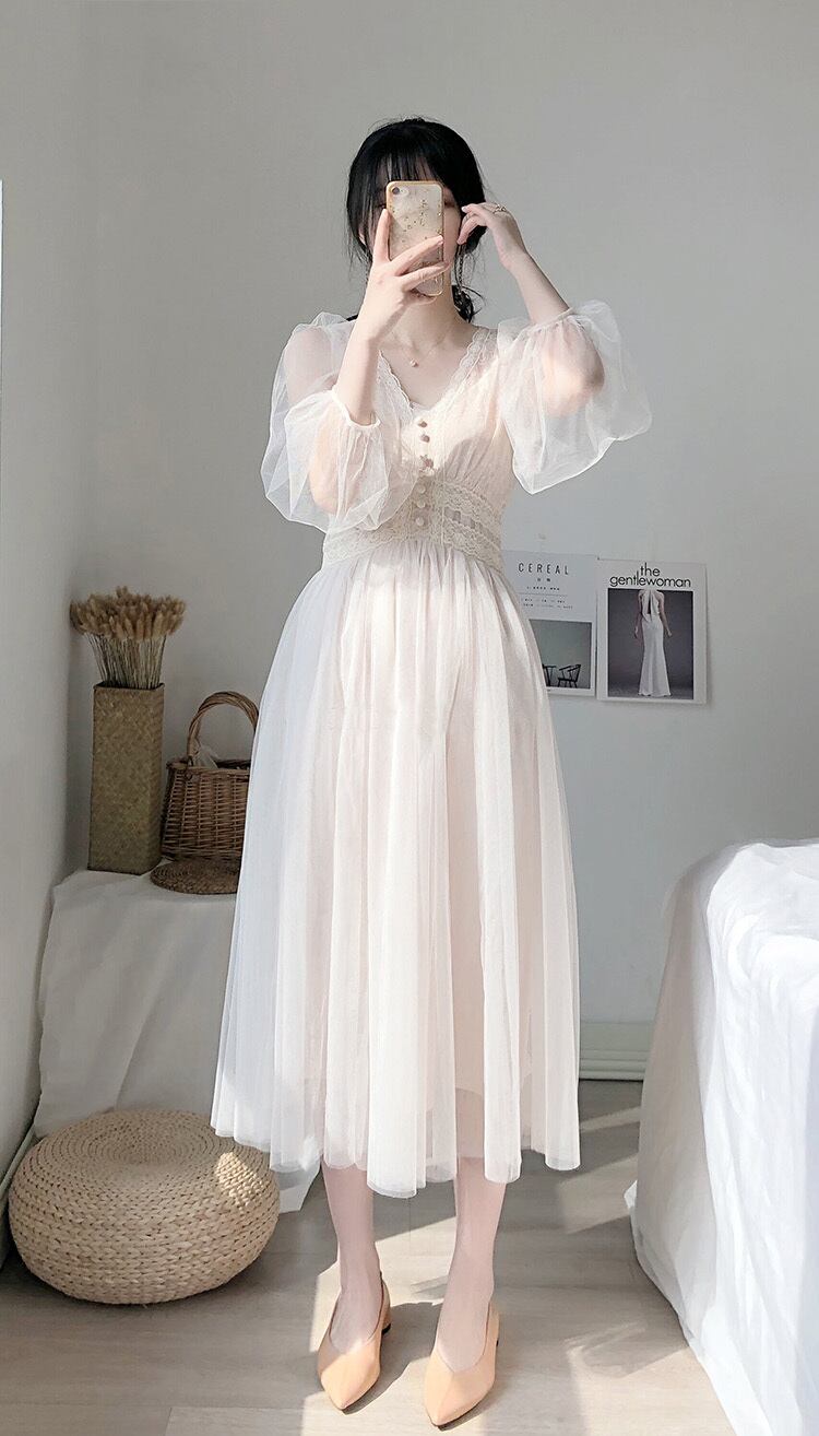 シフォンワンピース トップス スイート ガーリー アプリコット ミドル丈 袖あり 長袖 ランタンスリーブ Vネック フレア スリム 細身 タイト 透け感 シアー 大人女子 大人 上品 おしゃれ デイリーウェア レトロ レトロ風 こなれ感 キュート かわいい 女子 個性的 デザイン 主役級 存在感 無地 春 スプリング 20代 10代 レディース 女性用 学生 学校 通学 デート お出かけ 女子会 食事会 着回し 普段使い ファッション コーデ S M L