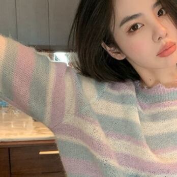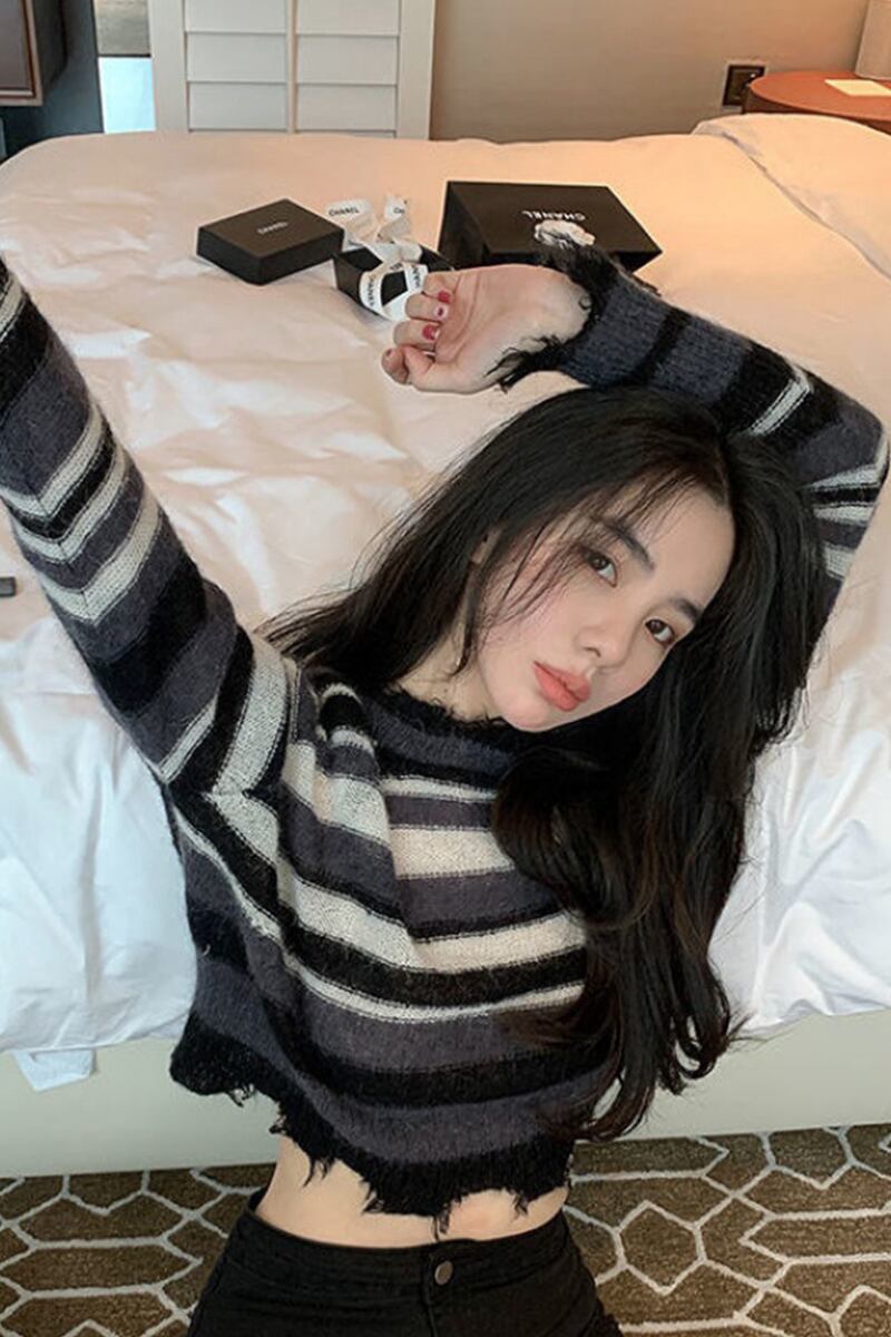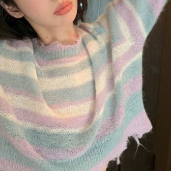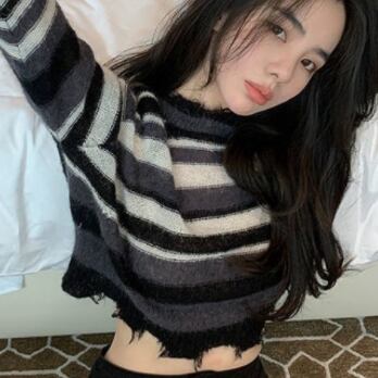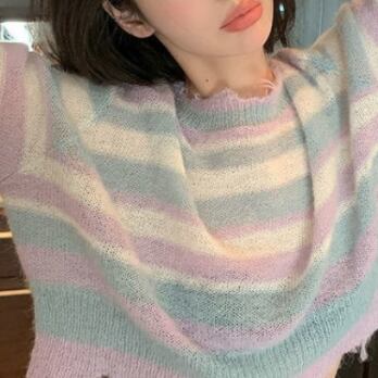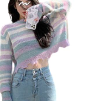 ショート丈ニット トップス セーター スイート ストリート ブラック 黒 ブルー 青 ミニ丈 ショート丈 袖あり 長袖 ラウンドネック 大人女子 大人 上品 おしゃれ デイリーウェア レトロ レトロ風 こなれ感 キュート かわいい 女子 個性的 デザイン 主役級 存在感 柄 ストライプ 縞模様 ボーダー 春 スプリング 秋 オータム 20代 10代 レディース 女性用 学生 学校 通学 デート お出かけ 女子会 食事会 着回し 普段使い S M L