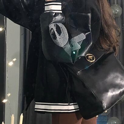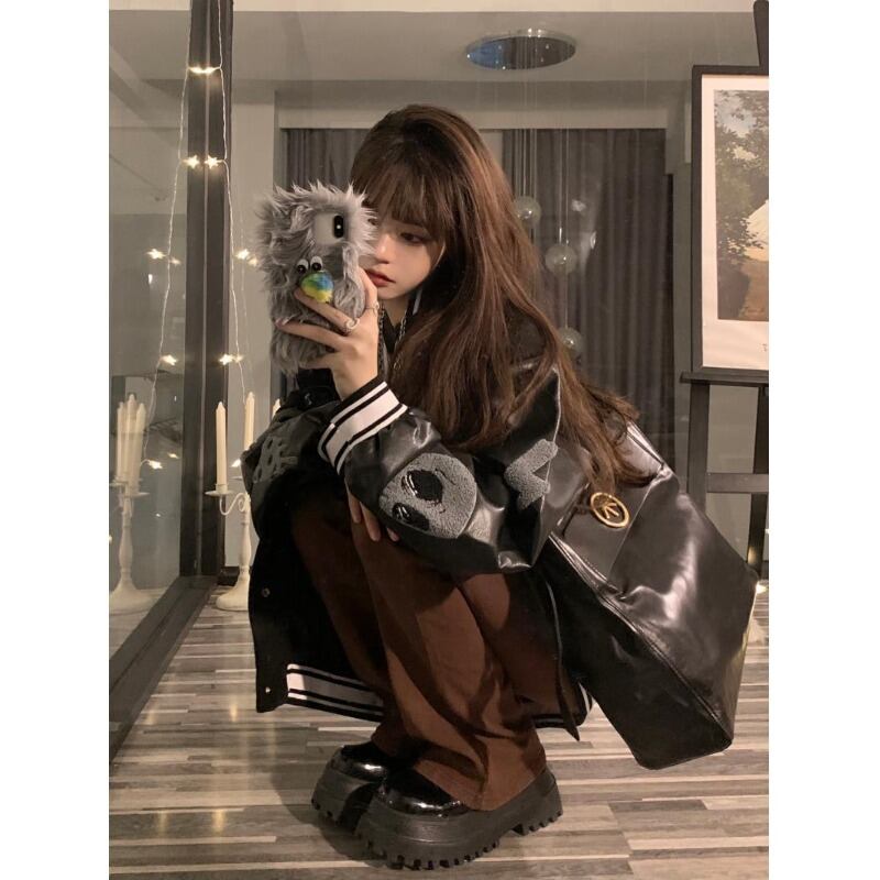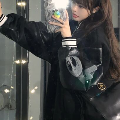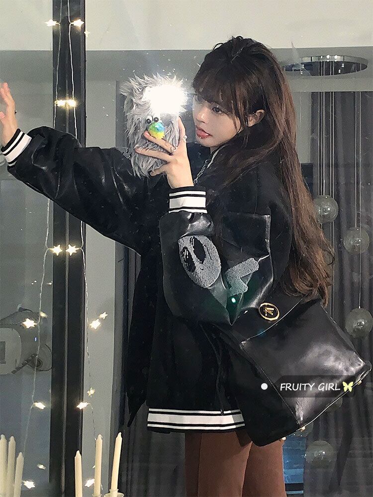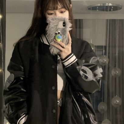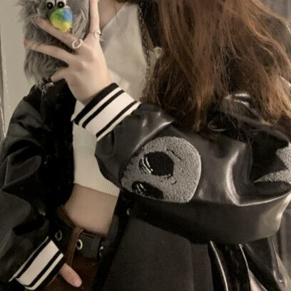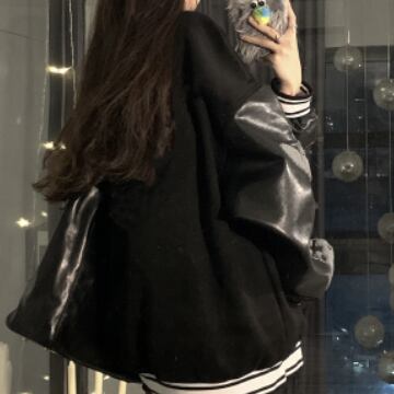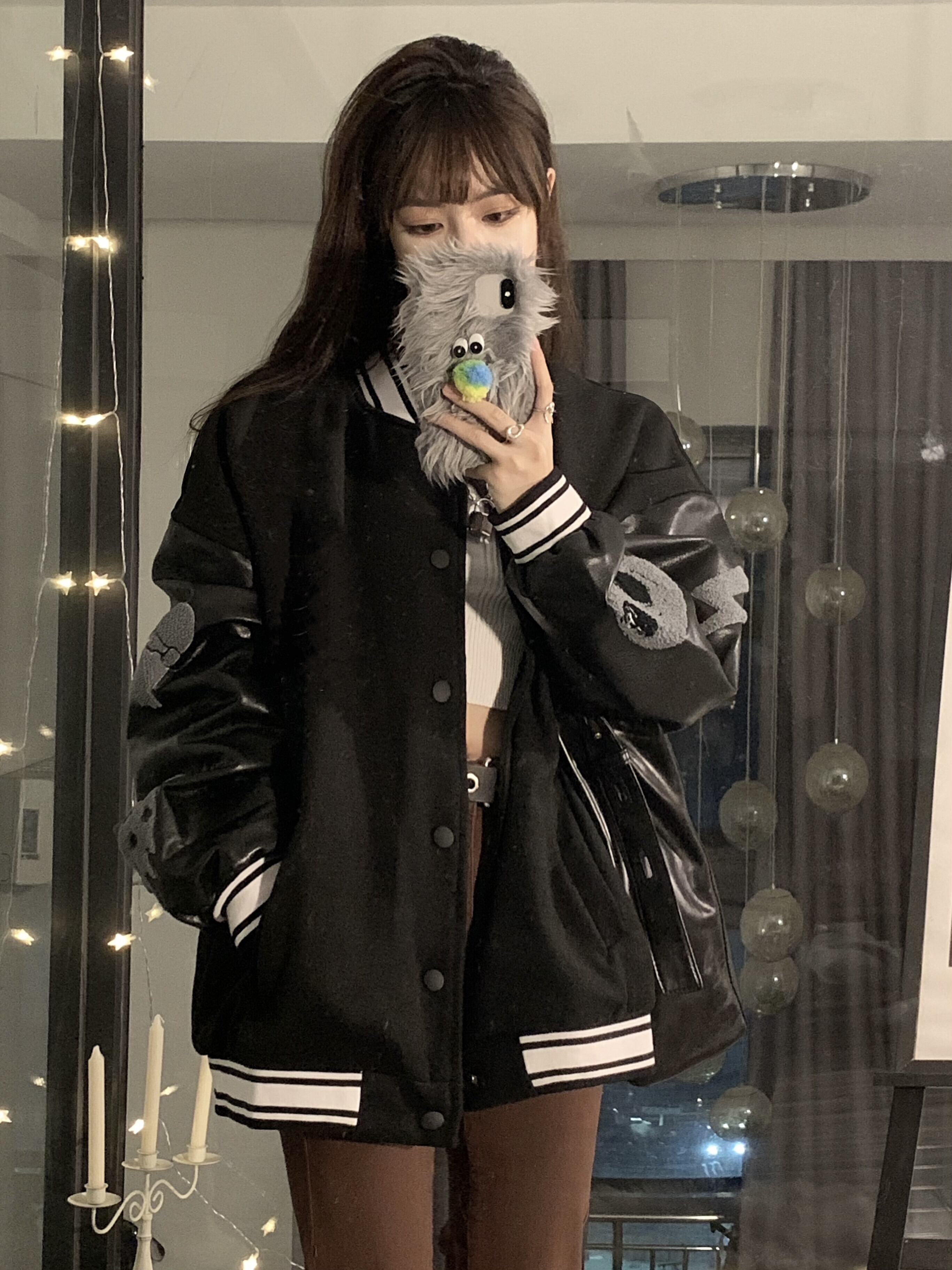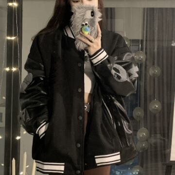 ジャケット アウター シャンパー 上着 黒 ブラック ミディアム丈 長袖 ストレート ポケット ボタン 異素材MIX カジュアル お洒落 かっこいい こなれ感 ラフ メンズライク ルーズ 個性的 クール 主役級 存在感 アメリカンスタイル 野球ユニフォーム風 ハード ロック プリント 春 秋 2022 10代 20代 レディース 学生 通学 お出かけ 公園 女子会 休日 パーティー イベント ライブ 普段使い 韓国 韓国系 ファッション コーデ スタイル 暖かい フリーサイズ ゆったり ゆる
