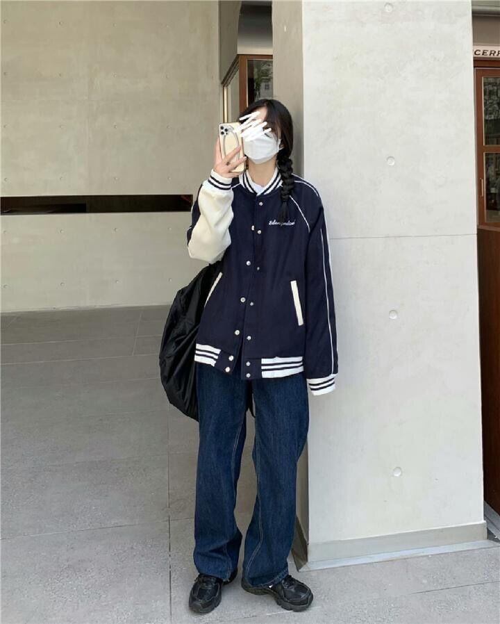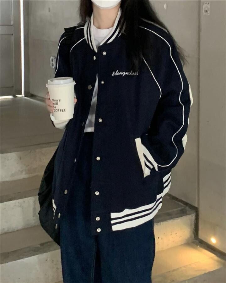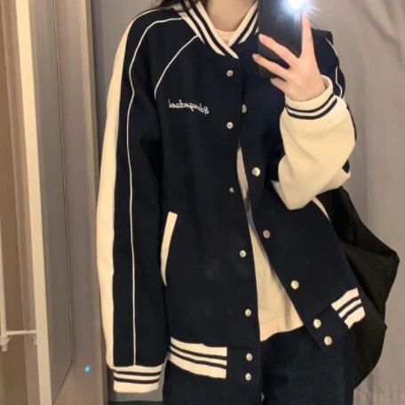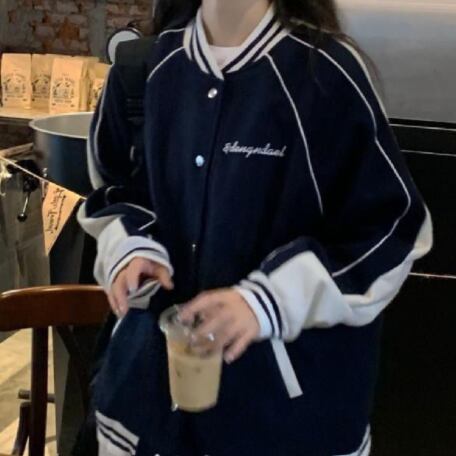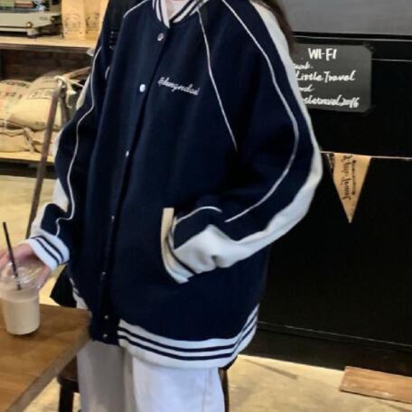 ジャケット アウター シャンパー 上着 ネイビー ミディアム丈 ストレート ポケット 前開き ボタン かわいい カジュアル お洒落 かっこいい こなれ感 ラフ メンズライク ボーイッシュ スポーティー ルーズ 個性的 抜け感 アメリカンスタイル 野球ユニフォーム風 テキスト 文字 秋 10代 20代 レディース 学生 通学 デート お出かけ 公園デビュー 女子会 休日 アウトドア 着回し 普段使い 重ね着 ファッション コーデ スタイル 楽ちん 定番 トレンド サイズ S M L XL ゆったり